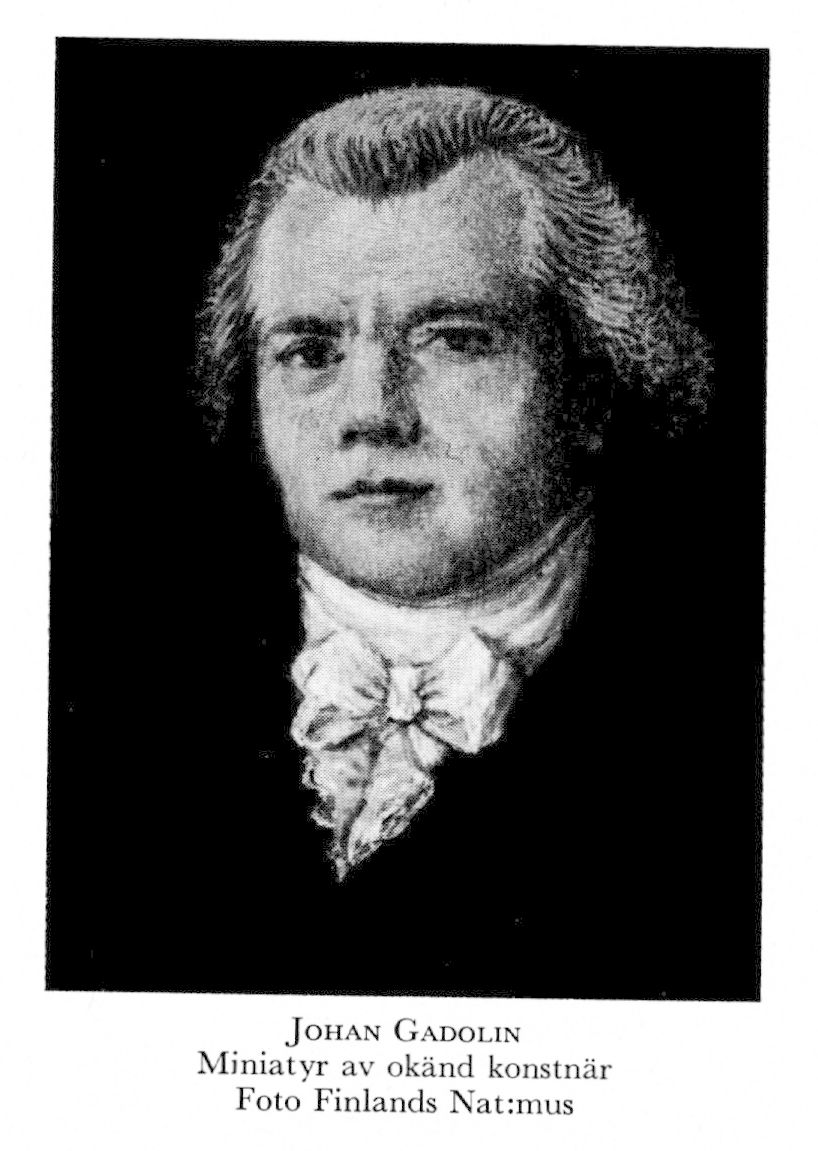 2 Gadolin, Johan, son till G 1, f 5 juni 1760 i Åbo, d 15 aug 1852 på Sunila säteri, Virmo (Åbo o Björneb). Inskr vid Åbo akad 10 april 1775, vid Uppsala univ 25 juni 1779, mag där 17 juni 1782, amanuens vid akad:bibl i Åbo 20 febr 1784, eo adjunkt 2 juli 1785, eo prof 8 aug s å, ord adjunkt 3 jan 1789, prof i kemi i survivance efter P A Gadd 6 maj s å, säte o stämma i fil fak 13 dec 1790, i konsistorium 10 jan 1792, ord prof i kemi 11 aug 1797 (installerad 20 april 1798)–20 maj 1822, initiativtagare till Finska hushålln:sällsk 1 nov 1797, rektor 1803–04 o 1811–12, allt vid Åbo akad. – LVA 1790, LVS 1791, LFS 1815, med o kir hedersdr i Helsingfors 18 juli 1840.