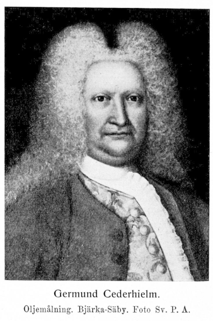 2. Germund Cederhielm, före adlandet Palm och Palmstedt, friherre till Säby och Cedersberg, den föregåendes son, f. 13 sept. 1661. d 26 aug. 1741 på Charlottenborg i Vinnerstads socken. Inskriven i Växjö skola 4 juni 1672; student i Uppsala 22 juli 1675—1681. Avlade askultanted i Göta hovrätt 9 jan 1677.[1] Auskultant i Göta hovrätt 1678; justitieborgmästare i Lidköping 17 dec. 1680; häradshövding i Hanekinds, Bankekinds, Åkerbo, Skärkinds och Memmings härader 5 nov. 1681; gjorde tjänstebyte med domhavanden i Väne, Flundre och Bjärke härad Maurits Holst (K. M:ts tillstånd 4 mars 1682) men återfick efter tvist med Holst sin förra domsaga 31 maj 1684; upphöjd i adligt stånd genom faderns adlande 10 apr. 1686; ledamot av kommissionen angående Kinnetorps kronopark i Västergötland 4 maj 1688; förordnad att deltaga i reglering av gränsen mellan Östergötland och Södermanland 1688; v. landshövding i Östergötland 1689; förordnad att utreda några förfalskade handlingar 1689; förordnad att omhänderhava omorganisationen av indelningsverket i Östergötland 1691—93; ordförande i kommissionen angående gränsen mellan Stora Kopparbergs län samt Närkes och Värmlands län å andra sidan 28 nov. 1692; assessor i Svea hovrätt 18okt. 1699; tillika ledamot av lagkommissionen 11 febr. 1702— 1716; lagman i Närke 22 apr. 1704; guvernör för hertig Karl Fredrik av Holstem 27 apr. 1706— 1716; lagman i Östergötland 23 juni 1711; landshövding i Skaraborgs län 4 okt. 1716 och i Södermanlands län 5 okt. 1716; deltog i riksdagarna 1719—27 och var därunder bl. a. deputerad rörande klassordningen på riddarhuset samt elektor till och ledamot av sekreta utskottet 1719, ledamot av justitiedeputationen och av deputationen över adelns privilegier 1720, ledamot av deputationen över adelns privilegier och av deputationen angående rådsprotokollen samt ordförande i ständernas kommission 1723, ledamot i justitiedeputationen och i deputationen över reduktions- och likvidationsverket, ur vilken senare han dock utgick, 1726—27; president i Göta hovrätt 2 sept. 1723; ordförande i kommissionen för återuppbyggnadsarbetet i Åbo, Björneborgs och Tavastehus län 8 dec. 1724 (instruktion); deltog i utredning om vattenfarten i Finland (jm.fr bet. föredraget i rådet 17 nov 1732).