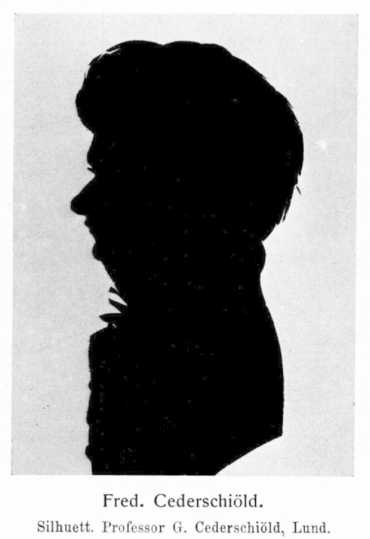 2. Fredrik Johan Cederschiöld, f. 25 mars 1774 på stamgodset Lidboholm i Sjösås socken, d 4 apr. 1846 i Lund. Föräldrar: kvartermästaren vid adelsfanan Staffan Kasper Cederschiöld och Anna Plantina Laurell. Åtnjöt undervisning i föräldrahemmet; elev vid Växjö skola från 1787; student i Lund 28 sept. 1793; inskriven i Smålands nation 22 okt. 1793; disp. 14 dec. 1793 (De perspicuitato dicendi, p. II; pres. K. Rydén); fil. kand. 2 dec. 1795; disp. apr. 1796 (De libro datico Lundensi, ejusque in historia Scaniao ecclesiastica usu, p. I; pres. G. Sommelius); fil. magister 23 juni 1796. E. o. amanuens vid akademiska biblioteket i Lund 16 nov. 1795; docent i teoretisk filosofi i Lund 8 dec. 1800; undervisade tillika i grekiska och latin; uppförd på andra förslagsrummet till filosofie adjunkt 17 mars 1802; adjunkt i teoretisk och praktisk filosofi i Lund 26 maj 1803; lektor i historia och moralfilosofi vid Växjö gymnasium 7 okt. 1807, men tillträdde aldrig denna befattning; juris et moralium professor vid Lunds universitet 29 juni 1808 med bibehållande av lektorslönen under två år; universitetets rektor 1811—12 och 1824— 25; kyrkoherde i Hardeberga och Sandby församlingars prebendepastorat 28 febr. 1821; prästvigd 11 juni 1821; förflyttad till Stävie och Lackalänga prebende 14 jan. 1824; prost över sistnämnda församlingar 21 apr. 1824; en av stiftarna av sparbanken i Lund 1833; åtnjöt tjänstledighet från professuren från 1836 (första gången beviljad 11 juni 1836); professor emeritus med bibehållen lön 30 nov. 1841. LNO 1837.