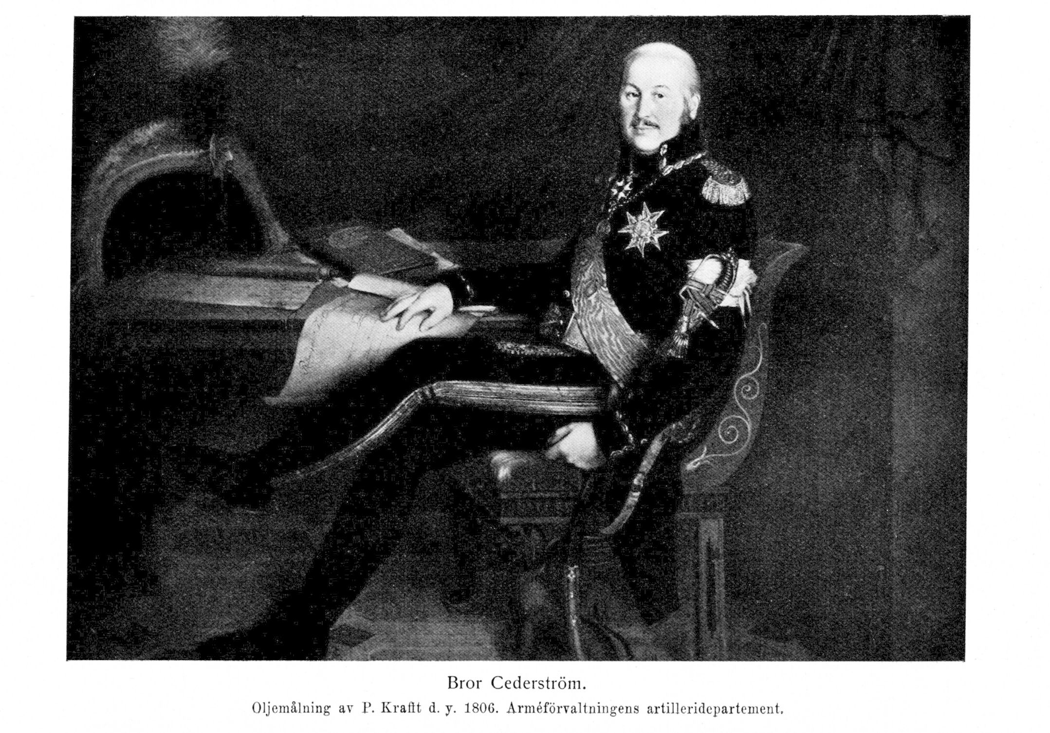 2. Bror Cederström, den föregåendes sonson, f. 7 sept. 1754 i Stockholm, d 8 okt. 1816 i Växjö. Föräldrar: landshövdingen och generalmajoren friherre Bror Olofsson Cederström och Sara Kristina Zedritz. Kadett i artilleriregementet 25 febr. 1766; idkade studier i Frankrike, bl. a. i La Rochelle; återkom 1769; volontär vid livgardet 1771; sergeant därstädes 7 okt. 1771; secondadjutant 11 dec. 1771; kapten i armén 13 sept. 1772; premiäradjutant 15 dec. 1773; löjtnant vid livgardet 5 apr. 1775; kammarherre hos drottningen 28 mars 1776; överadjutant hos konungen och major i armén 26 maj 1777; erhöll genom tjänstebyte fänriks lön 28 nov. 1777; generaladjutant av flygeln och överstelöjtnant i armén 7 febr. 1779; stabskapten vid livgardet 14 juni 1780; ståthållare på Gripsholms slott och i Mariefreds stad 24 jan. 1781—o mars 1795; kompanichef vid livgardet 21 febr. 1781; hovmarskalk hos konungen 26 okt. 1781; erhöll säte och stämma i krigskollegiet och i krigskommissariatsdepartementet 23 apr. 1782; generaladjutant och överste i armén 14 dec. 1786; överstelöjtnant och sekundchef vid livgardet 18 jan. 1788; embarkerade med gardet till Finland 22 juni 1788; kommenderade avantgardet vid Värälä 25 juni 1789; anförde gardet vid Liikkala 3 juli 1789; gjorde med fyra bataljoner ett anfall på Skogsby för att favorisera Högfors' intagande 18 juli 1789; var med regementet i arriärgardet under reträtten från Liikkala 21 juli 1789; bevistade bataljen vid Fredrikshamn 15 maj 1790; chef för landstigningstrupperna vid Björkö kyrka 7 juni 1790; konungens tjänstgörande generaladjutant 1 febr. 1793—18 juli 1796; generalmajor 8 apr. 1793; erhöll avsked från hovmarskalksbefattningen 12 febr. 1793; ledamot av kommittén för granskning av de under krigskollegiets disposition ställda passevolanskassor 14 mars—6 dec. 1794; chef för ridande artilleriet 23 sept. 1794; general en chef för allt artilleri och ledamot av krigskollegiets generalfälttygmästardepartement 7 dec. 1794—9 maj 1796; ordförande i kommittén angående nytt fältstatreglemente 15 dec. 1794—26 apr. 1796; ledamot av kommittén för granskning av statssekreteraren Kr. v. Numers' redogörelse för utrikes försäljning av krut och salpeter 19 apr. 1795 (bet. föredr. 4 maj 1795); ordförande i kommittén för omarbetning av krigs- och sjöartiklarna 1795; avsänd till Pommern för undersökning av oroligheter 24 febr. (bet. 16 apr. 1796); överste för norra skånska kavalleriregementet och general en chef i Skåne 26 apr. 1796; tf. generalguvernör i Pommern och kansler för universitetet i Greifswald 20 apr. 1796; ordförande i pommerska visitationskommissionen 20 apr. (instruktion 21 maj) —6 aug. 1796; ledamot av kommissionen angående matrikelverket i Pommern 23 maj 1799; tf. generalguvernör i Pommern 6 sept. 1799; erhöll avsked från befattningen som general en chef i Skåne 19 febr. 1801; president i krigskollegiet 31 jan. 1802; erhöll expektans å länspartikeln Zetel-witz 7 apr. 1802 men sålde sin rätt hösten 1802 (jmfr K. brev 27 okt. 1802); ledamot av pommerska beredningen 1 sept. 1802 och av kommissionen angående borgaren J. M. Gemeinhardts andraganden angående Stralsunds magistrat och stadsväsen 15 sept.—5 dec. 1802; konstituerad att granska regementenas innestående fordringar 8 sept. 1802; ordförande i artillerikommittén 8 sept. 1802—2 juli 1807; generalintendent vid höstmanövern 4 okt. 1802; ledamot av kommittén för utseende av lokal å Skeppsholmen åt gevärsarsenalens verkstäder 6 okt.—2 nov. 1802; generalinspektör över kavalleriet i Sverige och ridande artilleriet i Pommern 27 okt. 1802; generallöjtnant 9 dec. 1802; generalinspektör över allt artilleri 9 febr. 1803—29 jan. 1808; ledamot av kommissionen för reglerande av Stralsunds författningar och styrelse 21 apr. (konstitutorial 27 apr.) —-sept. 1803 (entledigad 5 sept.); ledamot av tillförordnade regeringen 25 juli 1803—7 febr. 1805 samt 31 okt. 1805—24 dec. 1807; ledamot av rikets ärenders allmänna beredning 24 dec. 1805; ordförande i kommittén angående förbättrad trossinrättning 1807; ledamot av hemliga krigsberedningen 11 jan.—17 febr. 1808 och av kungliga beredningen 13 jan. 1808—13 mars 1809; ordförande i krigskollegiets krigsdepartement 4—18 mars 1808; beordrad att göra generallöjtnants tjänst vid armén i Skåne 10 mars 1808; befälhavare för högra flygeln av södra armén 8 apr. 1808; general en chef för västra armén 9 aug. 1808; erhöll avsked från presidentskapet i krigskollegiet 13 febr. 1809, från befattningen som generalinspektör över kavalleriet 14 juni 1809, från överstebeställningen vid norra skånska kavalleriregementet 4 aug. 1809 samt ur rikets tjänst 8 dec. 1812. RSO 1772; KSO 1790; KmstkSO 1794; stiftande hedersledamot i krigsmannasällskapet 1796 (styresman 1803—04); RoK av KMO 1802.