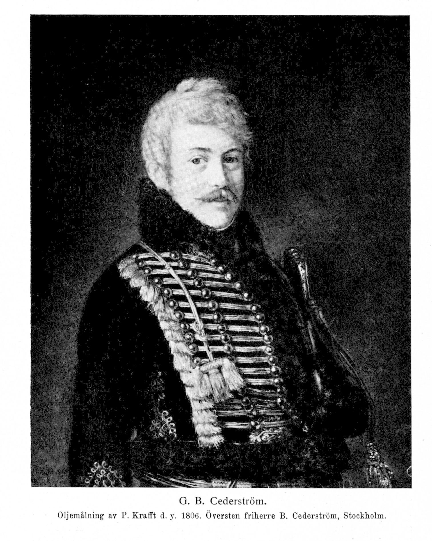 7. Gustaf Albrecht Bror Cederström, son till C. 2 i hans första gifte, f. 21 sept. 1780 på Signildsberg i Håtuna socken, d 21 dec. 1877 i Jönköping. Volontär vid Svea livgarde 17 apr. 1784; fänrik därstädes 10 aug. 1784 med tur från 17 apr. 1784; fjärde adjutant 1 mars 1790; tredje adjutant med lön 19 dec. 1790; avlade officersexamen 11 mars 1792; förste sekundadjutant; hovmarskalk 12 febr. 1793; löjtnant 2 aug. 1795; stabsadjutant hos konungen 2 nov. 1795; kurir till Pommern våren 1796; med bibehållen tur placerad som ryttmästare vid Mörnerska husarregementet 26 okt. 1796 (resolution om tur 13 mars 1797); stabsryttmästare därstädes 21 febr. 1798; överadjutant hos konungen och major i armén 8 sept. 1800; chef för generalguvernörens över Skåne stab under kriget mot England 1801; sekundmajor vid regementet 28 sept. 1801; premiärmajor 26 okt. 1801; överstelöjtnant vid regementet 5 juni 1802; generaladjutant av flygeln 22 sept. 1802 och vid kavalleriinspektionen 11 nov. 1802; kommendant i Hälsingborg 1808—10; bevistade riksdagarna 1809—15 och var därunder bl. a. ledamot av bankoutskottet 1810 urt; överste i armén 10 juli 1809; avsänd att öppna reklamationsunderhandling i Köpenhamn 1810; chef för militärbefälhavarens i Pommern stab 1811; generaladjutant 14 jan. 1812; generalmajor 14 dec. 1813 (konfirmation 1 mars 1814); chef för f. d. Mörnerska, därefter Cederströmska husarregementet 9 jan. 1816—13 maj 1823; brigadgeneral vid kavalleriet 11 juni 1816; chef för andra kavalleribrigaden 9 sept. 1816; ledamot av kommittén angående förlusten å furageringsanslaget för livgardet till häst 24 nov. 1817—5 dec. 1818; tf. generalbefälhavare i Skåne 8 febr. 1819; tf. inspektör för andra kavalleriinspektionen 6 juli 1819— 16 mars 1824 (se K. brev 20 juli 1819); chef för tredje kavalleribrigaden 1822; inspektör för andra kavalleriinspektionen 16 mars 1824—1 okt. 1832; generallöjtnant 11 maj 1826; generalbefälhavare i första militärdistriktet och tf. inspektör för kavalleriet där 7 dec. 1833; v. ordförande i Malmöhus läns hushållningssällskap 1834; ordförande i Rönnebergs kontrakts hushållskommitté; ordförande i Skånska hypoteksföreningens direktion vid dess stiftande; ledamot av unionskommittén 19 juli—27 dec. 1839 och av kommittén angående svenska skärgårdens befästande 25 okt. 1839 (bet. ink. 8 dec. 1839); statsråd 28 mars 1840 och chef för lantförsvarsdepartementet 16 maj 1840; erhöll avsked från dessa ämbeten 7 dec. 1840 befälhavare för den i Skåne sammandragna armékåren 5 maj 1848 samt tillika över de norska trupperna i Skåne 17 juni 1848; erhöll avsked ur krigstjänsten 28 nov. 1848. LKrVA 1805; RSO 1807; RmstkS02kl 1814; KSO 1815; KmstkSO 1819; RoK av KMO 1838; HedLLA 1845; KmstkNS:tOO 1848; innehade även utländska ordnar.