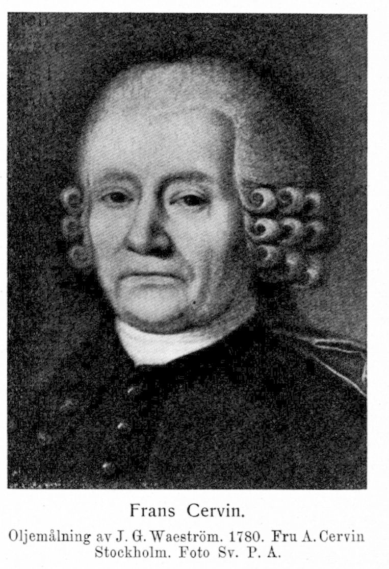 1. Frans Cervin, f. 20 jan. 1705 i Fulltofta prästgård, d 3 juli 1789 i Karlshamn. Föräldrar: kyrkoherden i Fulltofta Elias Cervin och Jannicha Lech (Annika Leche). V. notarie enligt guvernören i Malmöhus län greve K. S. Hårds fullmakt 26 nov. 1724; tf. auditör vid regementskrigsrätten i Landskrona fästning utan lön 1724—okt. 1737 och därefter mot arvode; stadskassör i Landskrona 29 juli 1725—13 mars 1734; kyrko- och skolföreståndare därstädes 16 maj 1729—31 dec. 1732; rådman därstädes 31 okt. 1732 och tillika stadsnotarie 13 mars 1734; uppfördes å tredje förslagsrummet till borgmästare i Landskrona 29 jan. 1734; ledamot av borgarståndet vid samtliga riksdagar 1734—39 och 1742—72 såsom representant för Landskrona 1734, för Landskrona, Karlshamn och Varberg 1738—39 samt för Karlshamn och vissa städer, som förenade sig med Karlshamn om gemensam riksdagsman 1742—72 och hade åtminstone under sina båda första riksdagar i uppdrag att ombesörja ståndets enskilda expeditioner samt var bl. a. elektor vid riksrådsvalen 1738, 1751 och 1765 samt ledamot av sekreta deputationen 1738—39 och 1760—62, av besvärsdeputationen 1738—39, 1742—43, 1751—52, 1755—56, 1760—62 och 1769—70, av sekreta utskottet 1742—43, 1751—52, 1765—66 och 1771-—72, av urskillningsdeputationen 1751—52, av bevillningsdeputationen 1751—52, 1760—62 och 1769—70, av sekreta utskottets deputerade över statsbristen 1755—56, av lant-och sjömilitiedeputationen 1755—56, av den s. k. Nordencrantzska växelberedningen 1760—61, av bankodeputationen 1760—62 och 1765—66, av fiskerideputationen 1760—62, av tulldeputationen 1765 —66, av stora sekreta deputationen 1765—66 och av dess s. k. lagutskott, av handels- och ekonomideputationen 1771—72 samt av defensionsdeputationen 1771—72; kämnärsrättens preses i Landskrona 23 febr. 1737; borgarståndets deputerade och sekreterare i kommissionen i Lund över helgonskyldsjämkningen i Skåne vid sammanträde 6 febr.—11 mars 1740; justitieborgmästare i Karlshamn 22 aug. 1740; preses i Karlshamns hallrätt 10 dec. 1740—1749 (trol. 31 dec); erhöll lagmans avsked 7 juni 1780.