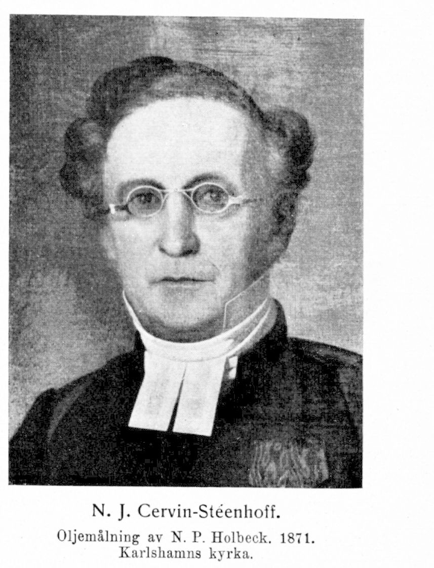 2. Nicolaus Johan Cervin-Stéenhoff, använde före moderns död 1848 blott faderns efternamn Stéenhoff, den föregåendes sondotterson, f. 19 juni 1805 i Karlshamn, d. 7 jan. 1879 därstädes. Föräldrar: handelsmannen Per Wandel Stéenhoff och Kristina Sofia Cervin. Student i Lund 4 okt. 1822; disp. 18 dec. 1824 (De vi juris romani in jus svecanum, p. II; pres. F. Schrevelius); filol. kand. 16 dec. 1828; fil. kand. 9 maj 1829; disp. 6 juni 1829 (Laus Melekschah et Bagdad, carmen Enveri, persice et suethice,. p. I; pres. E. S. Bring); fil. magister 23 juni 1829; avlade teor. teol. examen 25 maj 1836, prakt. teol. examen 17 juni 1836 och prästexamen 21 juni 1836; prästvigd 22 juni 1836. Tf. lärare i Karlshamns skola från 12 apr. 1823 till terminens slut; tf. kollega därstädes från 1 okt. 1829 till terminens slut (förordnande 30 sept.); privatlärare i Stockholm; e. o. kanslist i krigsexpeditionen 1830 —34; e. o. prästman (tidvis v. pastor) i Hoby och Öljehult från 22 juni 1836, i Tving och Eringsboda 18 okt. 1837—1 maj 1841, i Oderljunga och Perstorp från 6 nov. 1841, i Bosarp och Strö 8 jan. 1842—10 sept. 1843, i Hällestad, Lunds stift, från 7 dec. 1843, i Hällaryd och Åryd från 7 febr. 1844, i Karlshamn och Asarum från 15 jan. 1845 samt i Mörrum och Elleholm 22 dec. 1845—maj 1855; ombud för Lunds nykterhetssällskap vid de tyska nykterhetsföreningarnas generalförsamling i Berlin 17—20 aug. 1845 med tjänstledighet för utrikes resor till nov. månads slut 1845; ombud för Lunds nykterhetssällskap och talare vid allmänna nykterhetsmötet i Stockholm juni 1846; kallades av Svenska nykterhetssällskapets direktion i Stockholm att hålla nykterhetsföredrag i rikets västra och södra delar, första gången 20 juni 1846; avlade pastoralexamen 1 okt. 1846; uppförd på andra förslagsrummet till kyrkoherde i Hoby och Öljehult 18 aug. 1847 och på tredje förslagsrummet till kyrkoherde i Mjällby 27 mars 1850; predikant vid cellfängelset i Karlshamn 10 mars 1854; tf. stadskomminister i Karlshamn 2 maj 1855; slottspredikant på Karlshamns kastell 23 jan. 1856; kallad till provpredikant av stadsförsamlingen i Karlskrona 1 maj 1857 och 5 okt. 1865 samt av Storkyrkoförsamlingen i Stockholm 6 okt. 1857 utan att antaga kallelserna; brunnspredikant i Karlsbad sommaren 1858 enligt ärkebiskopens förordnande 8 maj 1858; kyrkoherde i Karlshamn 21 aug. 1863 (tillträdde 1865); kontraktsprost i Listers och Bräkne kontrakt 23 maj 1865. Teol. hedersdoktor i Erlangen 12 nov. 1862 (erhöll K. M:ts tillståndsbrev 9 jan. 1863); hedersledamot av Blekinge nation i Lund 1867; LNO 1868.