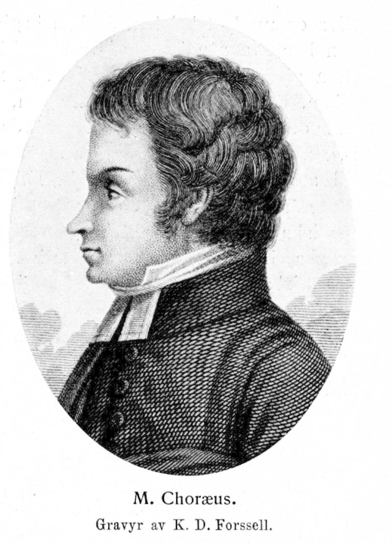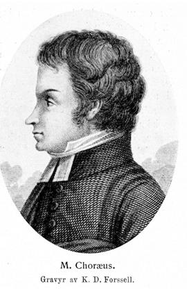 Choræus, Michael, f. 15 mars 1774 i Vörå, Österbotten, d 3 juni 1806 på Karlberg. Föräldrar: pastorsadjunkten i Vörå, sedermera komministern i Kristinestad Mikael Choræus och Anna Margareta Hammar. Inskrevs som skeppsgosse på ett krigsfartyg i Stockholm 1790, men återtog värvningen; åtnjöt undervisning hos fosterfadern, domprosten J. M. Fant i Västerås 1790—92; student i Uppsala 12 okt. 1792; disp. 3 dec. 1794 (Historia librorum catecheticorum, p. 1; pres. G. F. Fant); fil. kand. 12 dec. 1796; disp. 17 maj 1797 (De legationibus svecicis in Orientem; pres. E. M. Fant); fil. magister 13 juni 1797; student vid Åbo universitet 20 mars 1799; stipendiat därstädes 1799—1802. Konditionerade i Jakobstad 1797—99 samt hos landshövdingen friherre E. G. von Willebrand 1799—okt. 1800 och hos f. d. landshövdingen greve R. V. De Geer okt. 1800—1802; docent vid Åbo universitet 30 juni 1799; adjunkt i teologi, moral och historia vid krigsakademien å Karlberg 6 maj 1802; prästvigd 3 juni 1802; avlade pastoralexamen i Åbo 28 juni 1802; regementspastor vid Södermanlands regemente 9 mars 1803; e. o. hovpredikant 27 apr. 1803; uppfördes på tredje förslagsrummet till tredje teol. professuren vid Åbo universitet i konsistoriets skrivelse till kanslern 19 nov. 1805. Erhöll pris i Svenska akademien 1799, 1801 och 1802 samt i Göteborgs vetenskaps- och vitterhetssamhälle 1799 och 1800.