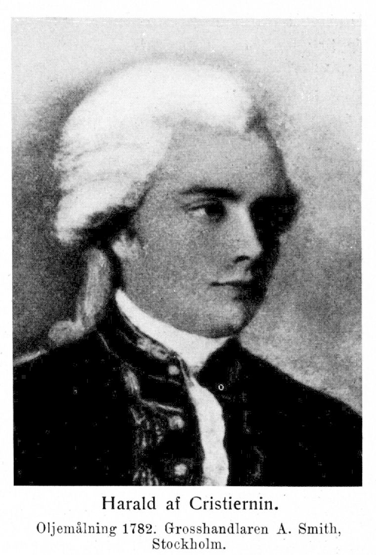 3. Harald af Cristiernin, före adlandet Christiernin, den föregåendes sysslings son, f. 25 dec. 1751 i Hille socken, d 1 maj 1799 i Karlskrona. Föräldrar: protokollsnotarien i bergskollegiet Harald Christiernin och Maria Charlotta Laurin. Student i Uppsala 21 sept. 1759; gick till sjöss 1767; lärstyrman vid amiralitetet och galärflottan 25 juli 1769; arklimästare därstädes 31 okt, 1770; konstapel 31 dec. 1770; avlade sjöofficersexamen 14 och 16 dec. 1771; löjtnant vid amiralitetet 27 okt. 1773; antogs i engelsk krigstjänst nov. 1773; erhöll tre års permission för utrikes krigstjänst 21 apr. 1774 men återinträdde i tjänst på hösten 1774; kapten vid amiralitetet och varvslöjtnant vid galärflottan 27 mars 1776; major vid amiralitetet och varvskaptenlöjtnant vid galärflottan 18 dec. 1776; erhöll 7 maj 1777 tre års permission för utrikes krigstjänst med placering vid göteborgska eskadern efter återkomsten; tjänstgjorde på engelska flottan 1777—80 som styrman, midshipman och löjtnant; återinträdde i svensk tjänst 1780; ambassadör till kejsaren av Marokko 1782—83 (kreditiv 11 juli 1782); adlad 22 juli 1783; chef för volontärkompaniet i Karlskrona 1 sept. 1783—1 mars 1795; överstelöjtnant 4 okt. 1785; ånyo ambassadör till kejsaren av Marokko 1786—87 (kreditiv 15 sept: 1786); överste 21 juli 1788; konteramiral 2 nov. 1795; chef för sjömilitiedepartementet i Karlskrona 26 jan. 1797; kommendant i Karlskrona 18 dec. 1797; ånyo chef för volontärkompaniet 4 okt. 1798. RSO 1780.