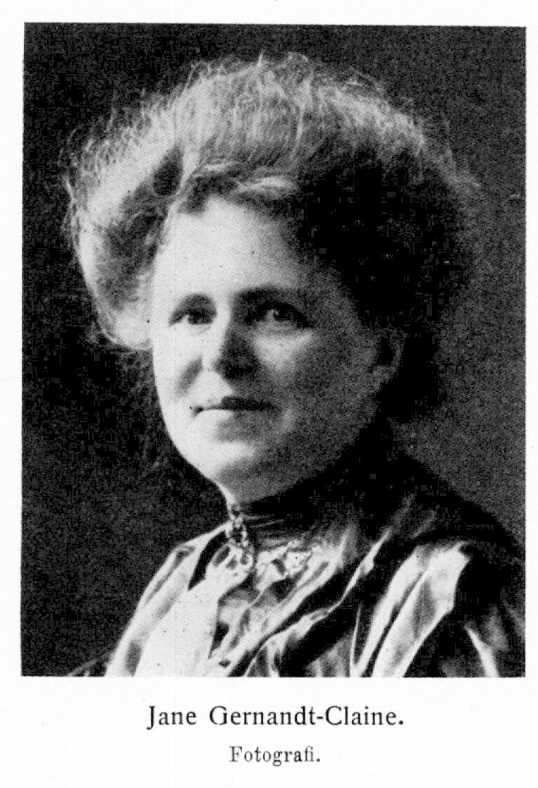 Claine, Jane Elise Vilhelmina Gernandt-, f. 4 okt. 1862 i Lund. Föräldrar: fabrikören Herman Julius Gernandt och Emma Elvira Gernandt. Åtnjöt undervisning vid Stenkulas skola i Malmö till hösten-1879; studerade vid h. lärarinneseminariet i Stockholm ht. 1881—ht. 1882. Skrev som ung noveller under signaturen Elna och framträdde i eget namn i Ny illustrerad tidning 1886; uppträdde på Svenska teatern i Helsingfors vintern 1891—92; har efter sitt giftermål med anledning av mannens förordnanden vistats på Madagaskar och Mauritius samt i East London och Port Elizabeth i Kapkolonien (1895—96), i Rosario i Argentina (1896—1900), i Rangoon i Birma (1900—03), i Baku i Kaukasien (1904—06), på Korfu i Grekland (1906—09), i Helsingfors i Finland (1909—17) och är sedan 1917 bosatt i Paris. — Medarbetare i ett stort antal tidningar, däribland i Nornan 1893 (tryckt 1892), i Idun från 1892, i Dagens nyheter 1893—96, i Ord och bild 1894—1924, i Svenska dagbladet 1898—1921, i Varia 1902, i Aftonbladet och Stockholms dagblad 1903—13, i Saisonen 1919—22, i Nya dagligt allehanda från 1920 och i Sydsvenska dagbladet från 1925; har dessutom medarbetat i Nordisk revy samt i den franska periodiska litteraturen (Le Matin, La revue mondiale, La revue franco-scandinave, La France vivante och La francaise). Medlem av La société des gens de lettres.