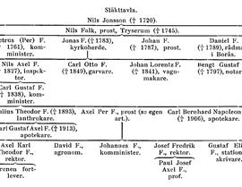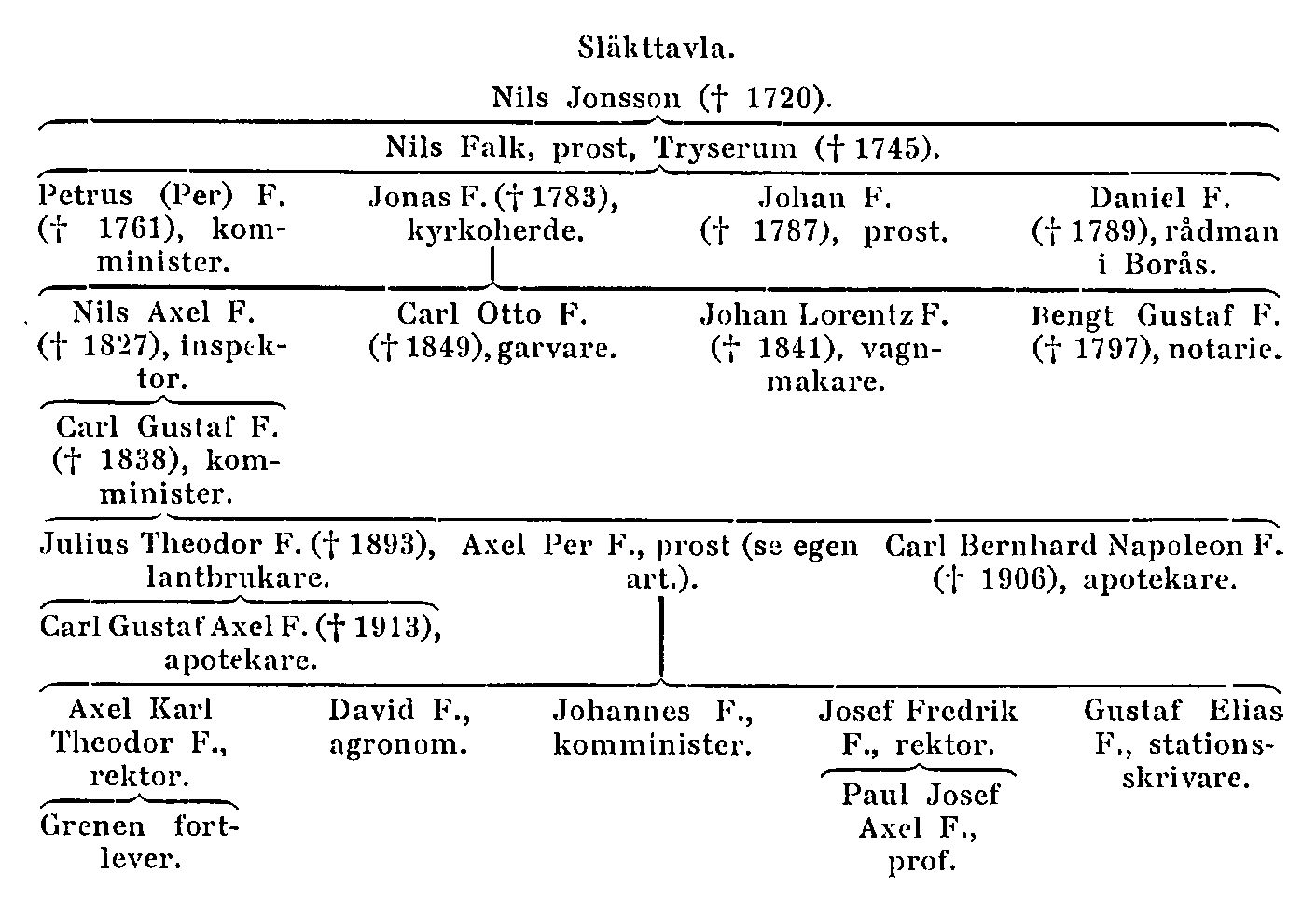 Släktens äldre gren, som lever, härstammar från prosten Nils F:s andre son kyrkoherden i Vallerstad (Ög.) Jonas F. (f. 1717, d. 1783) och dennes son lantbruksinspektoren Nils Axel F. (f. 1752, d. 1827). Av den sistnämndes bröder blev en garvare och en vagnmakare; deras barn åter gingo till arbetarklassen och ha ej kunnat följas. Den nämnde N. A. F. var far till komministern i Västervik Carl Gustaf F. (f. 1791, d. 1838). Denne hade flera söner. Av dessa blev lantbrukaren Julius Theodor F. (f. 1820, d. 1893) far till apotekaren i Töreboda Carl Gustaf Axel F. (f. 1863, d. 1913). J. Th. F:s yngre bröder voro prosten i Kumla i Närke fil. dr Axel Per F. (se art. nedan) samt apotekaren i Jönköping Carl Bernhard Napoleon F. (f. 1835, d. 1906). Av prosten doktor Axel F:s barn märkas fil. doktor Axel Karl Theodor F. (f. 1854, d. 1919), rektor i Norrtälje 1896–1907, sedan i Södertälje, och fil. doktor Josef Fredrik F. (f. 1864, d. 1952), först lektor i franska och engelska i Halmstad, folkskoleinspektör där 1903–06 samt rektor i Gävle 1906–29. Den sistnämnde var i sitt gifte med Augustine Camille Marie Joseph från Frankrike fader till fil. doktor Paul Josef Axel F. (f. 1894, d. 1974[1]), som sedan 1943 är professor i romanska språk vid Uppsala universitet. En prosten A. P. F:s dotter, Karin F. var gift med prosten Axel Lundqvist och mor till fd. rektorn fil. dr Nils Lundqvist, Stockholm, som äger en av henne i fem bd utarbetad släkthistoria över släkten F. under 1800-talet.