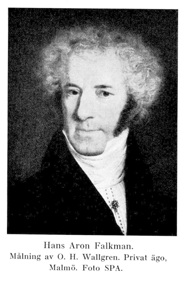 4. Hans Aron Falkman, bror till F. 3, f. 7 febr. 1776 i Malmö (Caroli), d. 9 april 1846 på Krapperup, Brunnby sn (Malm.). Student vid Lunds univ. 16 nov. 1789; jur. ex. där 11 dec. 1792; auskultant vid Malmö rådhusrätt 27 maj 1793; e. o. kanslist i Justitierevisionsexpeditionen 8 okt. 1794; auskultant i Svea hovrätt 19 dec. s. å.; vice notarie i hovrätten 11 febr. 1795; aktör i Kanslirätten 25 april 1797; avsked som aktör med advokatfiskals namn 13 okt. 1802; rådman i Malmö s. å. (vald 1 sept., installerad 28 okt., fullmakt trol. redan 25 okt.); tf. borgmästare där för kortare tider 10 mars 1812, 6 jan. 1815, 30 maj 1816 och 29 sept. 1818; borgmästare där 14 dec. 1819 (installerad 4 febr. 1820); lagmans namn, heder och värdighet 5 nov. 1821; revisor av bankodiskontverkets förvaltning och räkenskaper 18 dec. 1824; riksdagsman för Malmö i borgarståndet 1809–10, 1810 (urt.), 1817–18, 1823 och 1828—30 (led. bl. a. i bankoutskottet och i särskilda utskottet 1809–10, i konstitutionsutskottet 1810 (urt.), 1817–18, 1823, 1828–30, i särskilda utskottet nr 1 1810 (urt.), i hemliga utskottet 1828–30). – RNO 1830.