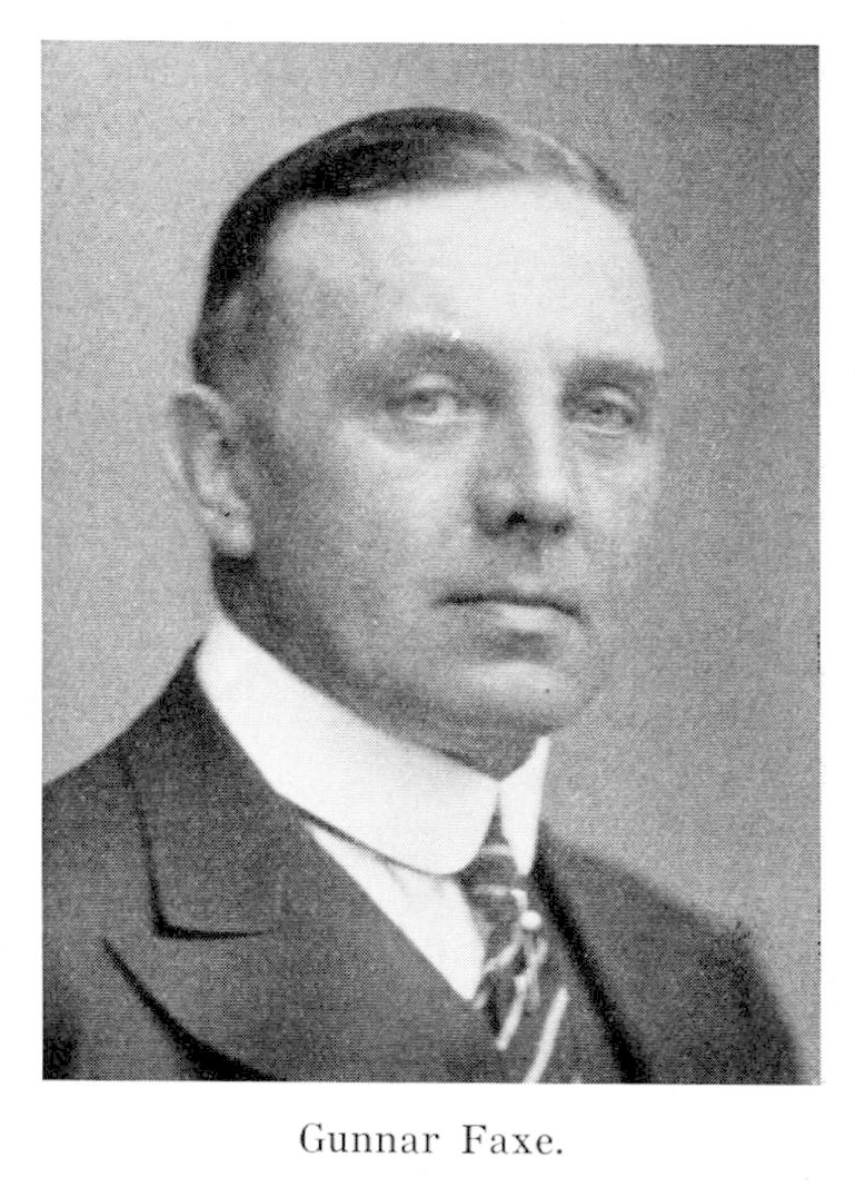 F., som 1923 blivit fransk konsul i Malmö, hade från 1924 kontor i och blev 1925 ägare av det gamla vid Larochegatan 4 belägna korsvirkeshus (Faxeska huset), som kom i familjens ägo 1842. F. verkade även som kommunalman, dels i stadsfullmäktige, dels i drätselkammaren, på vars andra avdelning han en tid var vice ordförande, samt satt även i olika styrelser, bl.a. för Rederi-a.-b. Öresund. Som ordförande i Malmö förskönings- och planteringsförening tog F. många goda initiativ, bl.a. till Ribersborgs badstrand. – Gunnar F. var en kraftig och storväxt man. Till hela sin läggning var han mångintresserad, med mängder av hobbies. Han var en ytterst praktisk man, därtill snabb i handling. Som affärsman, industriledare och kommunalman var han uppslagsrik och orädd att taga risker. Hans, trots svårigheterna, framgångsrika affärsverksamhet var av betydelse även för hans hemstad. Stor trädgårdsvän och även kunnig sådan var Gunnar F. ordförande i Skånska trädgårdsföreningen, liksom han var en intresserad medlem av KAK. Sin lediga tid tillbringade han ofta på den av honom inköpta gården Nedre Århult (Tåssjö sn, Krist.) eller i sin villa i Torekov.