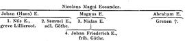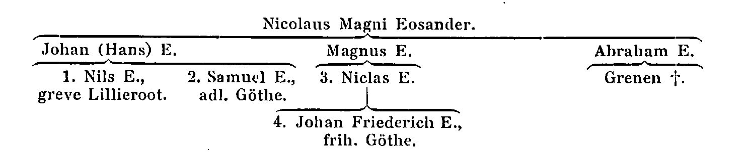 Eosander, släkt. Kyrkoherden i Åsbo pastorat (Ög.) Magnus, nämnd omkr. 1550, var fader till Nicolaus Magni Eosander (d. 1606), som blev fil. magister utrikes samt kyrkoherde i Skällvik (Ög.). Av dennes söner blev Johan (Hans) E. (f. 1600, levde 21 maj 1659, men var d. 19 no v. 1660) kyrkoherde i Åsbo och kontraktsprost, Magnus E. (f. 1603, d. 1658) kyrkoherde i Örberga (Ög.) och Abraham E. (f. 1605, d. 1679) komminister först i Skällvik, sedan i Svanshals och Kumla (Ög.). Den sistnämndes gren utdog snart (på kvinnosidan 1735). Johan (Hans) E. var fader till dels diplomaten, k. rådet Nils (E., 1674 adlad, 1697 friherre och 1704 greve) Lillieroot (se denne), som själv slöt sin ätt 1705, dels diplomaten Samuel (E., 1698 adlad) Göthe (se denne; f. 1637, d. sonlös 1712), som 1712 likaledes själv slöt sin ätt på svärdssidan. Magnus E:s (d. 1658) son var arkitekten i bl. a. Narva, generalkvartermästarlöjtnanten Niclas E. (d. 1698; E. 3). Dennes son var den svensk-tyske arkitekten och diplomaten, generallöjtnanten Johan Friederich Eosander (E. 4), som 11 dec. 1712 erhöll k. brev på att han inbegreps i (sin faders kusin) den ovan nämnde Samuel Göthes adelskap och som 1713 blev friherre Göthe men i intetdera fallet tog introduktion; han är därför mest känd som J. F. Eosander. Han slöt själv 1729 friherrliga ätten Göthe.