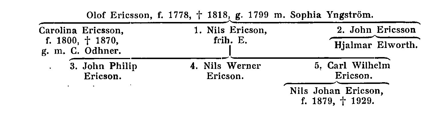Från den världsberömde John Ericsson (E. 2) utgick icke någon släktgren av samma namn, men väl hade han utanför äktenskapet med officersdottern Caroline Lilliesköld (senare g. m. den berömde juristen professor C. J. Schlyter) en son, överdirektör Hjalmar Elworth, om vars namn och levnadsöde se SBL, 13, s. 427; han dog barnlös.