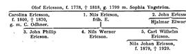 Ericson, friherrlig ätt, och Ericsson, släkt från Nordmark (Värml.). Från konstmästaren, sedermera gruvfogden vid Nordmarks gruva i socknen av samma namn Sven Svensson Stadig (f. omkr. 1645, d. 1682) härstammar den släkt Ericsson, som blev ryktbar genom bröderna Nils och John Ericsson, av vilka den förre under sitt adelsnamn, Ericson, blev stamfar för släktens friherrliga linje. Sven Stadigs son, gruvbrytaren vid nämnda gruva, sexmannen Magnus Svensson Stadig (f. 1681, d. 1727), var fader till gruvbrytaren vid Nordmark Eric Magnusson (f. 1724, d. 1755), vars son var bruksidkaren där Nils Ericsson (f. 1747, d. 1790). Denne äktade en prästänka Anna Maria Petrén (f. 1745, f 1783), dotter av en bruksinspektör, i vilket gifte föddes sju barn, som bibehöllo faderns patronymikon, vilket därmed förvandlades till släktnamn. Bland barnen var äldste till mogen ålder hunne sonen brukspatronen vid Nordmarksberg Eric Ericsson (f. 1777, d. 1817), g. m. brukspatronsdottern Johanna Maria Robsahm (vars mor hette Anna Lisa Geijer); de hade blott en dotter som dog tidigt. Yngre bror till Eric Ericsson var Olof Ericsson (f. 1778, d. 1818), som i slutet av 1790-talet blev bokhållare vid Långbanshyttans bruk (Färnebo sn, Värml.), ej långt från Nordmark. Förvaltaren vid Långbanshyttan, gruvfogden Johan Yngström (f. 1739, d. 1801), hade en vacker dotter, Brita Sophia Yngström (f. 1778, d. 1853), som äktade Olof Ericsson 1799. Då svärfadern i okt. s. å. drog sig tillbaka, blev Olof E. antagen till disponent och förvaltare (gruvfogde) av gruvan, strax därpå bisittare i bergstingsrätten och bosatte sig som gift vid stranden av Hyttsjön. Emellertid försämrades vid sekelskiftet förhållandena i dessa gruvor snabbt. Man sökte spränga sig ned till nya fyndigheter, men vinsten blev ringa. Detta medförde, att Olof E. blev skuldsatt och jan. 1803 tog avsked såsom gruvfogde. Familjen, i vilken år 1802 fötts sonen Nils Ericsson och år 1803 dennes broder John Ericsson, flyttade till Kytthagen nära Långban under bekymmersamma förhållanden. Olof E. fick arbeta som bergsprängare och förman för ett gruvbrytarlag. Några år senare blev han inspektor vid Gustafsgruvorna i samma trakt, men kriget 1808–09 försämrade möjligheterna, och sommaren 1809 var han arbetslös. Emellertid hade vid denna tid kanalarbetet mellan Vänern och Vättern börjat; Olof E. sökte sig dit och antogs som bergsprängare där. Familjen flyttade till Forsvik (Undenäs, Skarab.), där den 1810–13 var bosatt. Fru Sophia Ericsson åtog sig här mathållningen för de vid kanalbygget anställda tjänstemännen och officerarna. Därmed befann man sig i den miljö, i vilken de båda senare så berömda sönerna, järnvägsbyggaren Nils Ericsson och uppfinnaren John Ericsson skulle få sin första skolning. Fadern Olof Ericsson arbetade senare vid Edets sågverk och vid Hajstorp, men då kanalbolagets ekonomi försämrades 1817, var Olof E. en av dem, som på hösten miste sin plats. Genom B. B. von Platens försorg blev han byggmästare vid Känsö karantänstation i Göteborgs skärgård, dit han flyttade ensam; han avled emellertid sept. 1818. Sönerna Nils och John hade då redan fått plats vid kanalbygget.