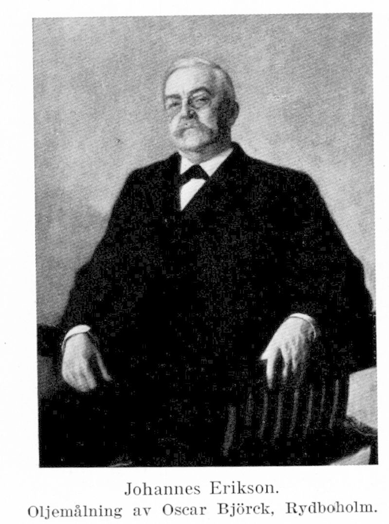 2. Johannes Erikson, den föregåendes son, f. 22 april 1839 i Kinna sn (Älvsb.), d. 11 jan. 1912 genom olyckshändelse. Skolstudier 1848—56 i en privat elementarskola i Göteborg; elev vid Göteborgs handelsinst. 9 jan. 1856–16 juni 1857; utbildningen kompletterad genom studieresor till England och kontinenten; tjänsteman vid Rydboholms Väfverifabrik 1857; disponent vid Rydboholms bolag 1873–84 och vid Rydboholms a.-b. 1885–1912; verkställande direktör i Varberg–Borås järnvägs a.-b. 1877–1907 samt ordf. i bolagets styr. 1903–07 och 1910–11; led. av centralstyr. för Borås enskilda bank 1879–1912; ordf. i styr. för Skandinaviska gummi a.-b. i Viskafors 1890–1912; verkställande direktör i Rydahls manufaktur a.-b. 1892–1912; ordf. i styr. för Kinnaströms väfveri a.-b. 1895–1912 och i Kungsfors' spinneri a.-b. 1898–1912. Landstingsman 1881—96; led. av riksdagens första kammare 1883–85 samt av dess andra kammare 1892–93; led. av Älvsborgs läns södra hushållningssällskaps förvaltningsutskott 1890–1912 samt dess ordf. 1895–1912; en av stiftarna av »De sju häradernas kulturhistoriska förening» i Borås 1903; ordf. i föreningens styr. 1903–12. RVO 1880; KVO2kl 1897; KVO1kl 1904.