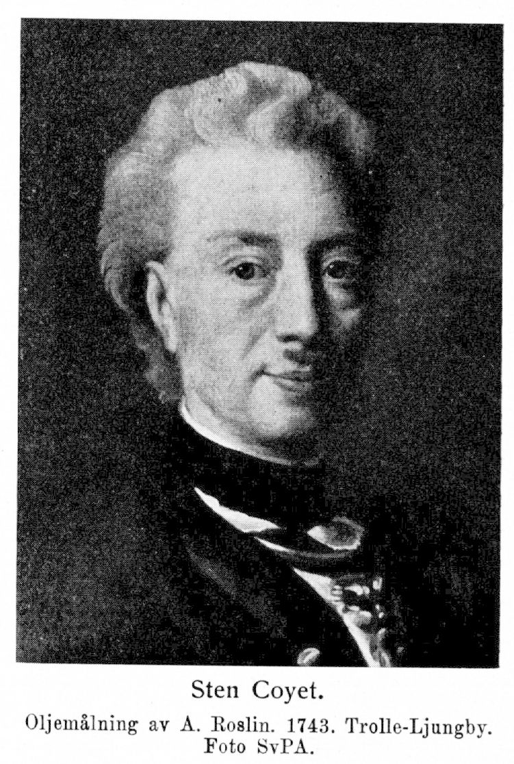 4. Sten Coyet, den föregåendes halvbroder, f. 22 okt. 1688 i Trolle-Ljungby församling, d. 23 okt. 1755 å Trolle-Ljungby slott. Musketerare vid överste M. Palmqvists värvade garnisonsregemente i Wismar 1703; sergeant därstädes 1703; fänrik 4 apr. 1705; löjtnant 9 apr. 1707; löjtnant vid Jönköpings infanteriregemente 3 maj 1707, kaptenlöjtnant därstädes aug. 1708; fången i slaget vid Pultava 28 juni 1709; erhöll efter återkomsten överstelöjtnants avsked 4 nov. 1721; bevistade samtliga riksdagar 1723—52 utom 1731 och var därunder bl. a. ledamot av privilegiedeputationen 1723, av placeringsdeputationen 1723, av allmänna besvärsdeputationen 1726—27 och av stora sekreta deputationen 1734 och 1738 —39, elektor vid rådsvalen 1740—41 samt ledamot av sekreta utskottet 1740—41, 1746—47 och 1751—52, av deputationen över blekingska besvären 1742—43, av handels- och manufakturdeputationen 1746—47, av sekreta utskottets deputerade över finansverket 1746—47 samt av bankodeputationen 1751—52; engelsk baronet (»riddare-baronett») vid äldste broderns död 1730. — Innehade Ljungby och Årups fideikommiss i Kristianstads län och Bengtsboda i Blekinge län. RSO 1748.