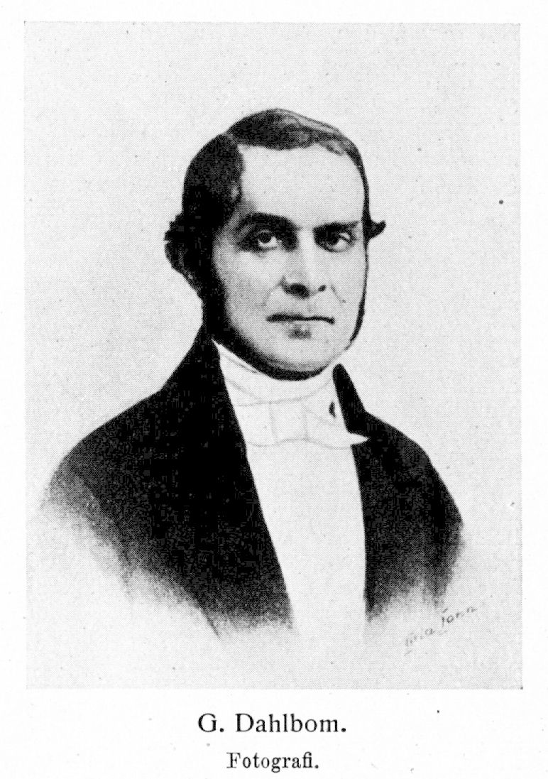 1. Anders Gustaf Dahlbom, f. 3 mars 1806 på Forsa, Härberga socken, d. 3 maj 1859 i Lund. Föräldrar: bataljonskirurgen, kir. kand. Anders Dahlbom och Fredrika Pihlgren. Student i Lund 29 sept. 1825; disp. 13 dec. 1826 (Supplementum dipterorum Sveciae, p. II; pres. K. F. Fallén); filol. kand. 18 juni 1828; fil. kand. 13 maj 1829; disp. 6 juni 1829 (Monographia pompilorum Sveciae; pres. K. F. Fallén); fil. magister 23 juni 1829; avlade med. farm. examen 22 dec. 1832; företog talrika studieresor, bl. a. i Sverige 1828, 1829, 1831, 1832 (särskilt i Lappland), 1834, 1835, 1840 (särskilt till Dalarnas och Jämtlands fjälltrakter) och 1841 till Öland och Gotland, till Tyskland 1838, 1842, 1843 och 1845, till Danmark 1839, till Norge 1840 och 1844 och till Paris och London 1855—56. Docent i naturhistoria vid Lunds universitet och amanuens vid dess zoologiska museum 26 febr. 1830; uppförd på tredje förslagsrummet till professuren i naturhistoria 23 maj 1832; examinator i naturvetenskaperna vid studentexamen från ht. 1833 och i levande språk ht. 1833—vt. 1834 och ht. 1841—vt. 1842; en av Lunds universitets åtta äldsta docenter 14 okt. 1834; kurator för Södermanlands nation i Lund 1838—47 och för Göteborgs nation därstädes 1846—49; uppfördes ensam å förslag till adjunkt i zoologi därstädes 14 nov. 1840, vilket förslag upphävdes genom kanslersbrev 30 okt. 1841; e. o. adjunkt i entomologi 30 okt. 1841; erhöll ett lönetillägg à 300 rdr bko med åliggande att ordna och vårda naturhistoriska museets entomologiska samlingar 11 jan. 1842; uppfördes å andra förslagsrummet till adjunkt, i zoologi i Lund 26 nov. 1842; adjunkt i entomologi och intendent för universitetets entomologiska samlingar 12 maj 1843 (med lön enl. K. brev 25 febr. 1843); e. o. professor i entomologi 20 febr. 1857. Ledamot av Sällskapet för inhemsk silkesodling 1836; LVVS 1837; LFS 1837; ledamot av Malmöhus läns hushållningssällskap 1839; hedersledamot av Östgöta nation i Lund 1850; var dessutom ledamot av ett stort antal utländska lärda samfund.