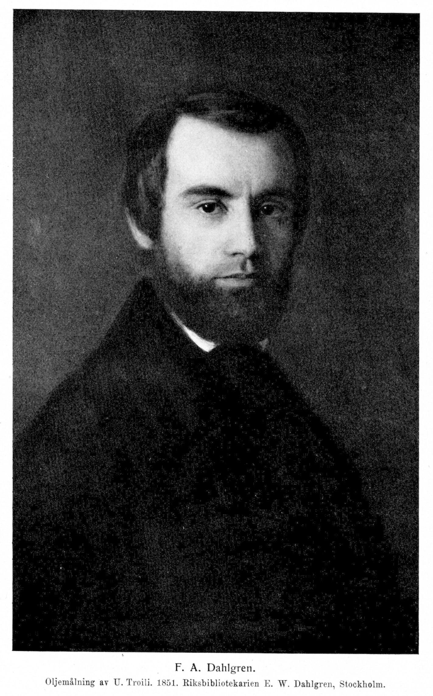 1. Fredrik August Dahlgren, f. 20 sept. 1816 i Nordmarks socken, d. 16 febr. 1895 i Djursholm. Föräldrar: förvaltaren vid Tabergs gruvor, bruksägaren Bartold Dahlgren och Anna Karolina Svensson. Elev vid Karlstads h. lärdomsskola ht. 1828 och gymnasium ht. 1831; student i Uppsala 15 dec. 1834; disp. 3 juni 1837 (Commentationes Demosthenicæ sect. I, p. IV; pres. K. V. A. Tham); fil. kand. 30 mars 1839; disp. 13 juni 1839 (Jacob Balde, latinsk skald ur sjuttonde århundradet; pres. P. D. A. Atterbom); fil. magister 15 juni 1839; vistades 1839—41 i Uppsala dels för vetenskaplig speciminering, dels som informator. E. o. kanslist i ecklesiastikdepartementets expedition 9 sept. 1841, i kammarkollegiet 1 okt. 1841 och i kommerskollegiet 30 sept. 1841—1848; e. o. amanuens i riksarkivet 16 dec. 1841; svarade för litteraturavdelningen i Svenska biet; sekreterare i Svenska fornskriftsällskapet från dess stiftande 1843; erhöll årligt arvode för tjänstgöring i riksarkivet enligt K. brev 29 jan. 1847; kopist i ecklesiastikdepartementets expedition 31 maj 1848; tf. förste amanuens i riksarkivet 8 juli 1853; Svenska akademiens amanuens 10 sept. 1854—1871; litteratör vid K. teatern 1 juli 1857—30 juni 1861; kanslist i ecklesiastikdepartementet och protokollssekreterare i K. M:ts kansli 5 jan. 1861; protokollssekreterare i departementet 13 juni 1862; ledamot av kommittén angående K. teatrarnas finansiella förhållanden 7 maj 1869—21 jan. 1870; expeditionssekreterare i K. M:ts kansli 22 dec. 1869 och i. departementet 25 apr. 1871; tf. byråchef från 1 juli 1874 (K. brev 12 juni 1874); ledamot av K. direktionen över Stockholms stads undervisningsverk 1875—80; kansliråd och byråchef 7 juni 1878; erhöll avsked med pension 17 juli 1882. Erhöll Svenska akademiens andra pris 1841; LSkS 1854; LMA 1866 (preses 1877—84); erhöll av Vetenskapsakademien det Letterstedtska priset »för utmärkt översättning av förtjänstfull skrift» 1866 och av Svenska akademien Karl XIV Johans pris »för litterära förtjänster» 1866; kanslist vid KMO 1867; en av de 18 i Sv. akad. 1871; RNO 1871; KNO1kl 1888; fil. jubeldoktor 31 maj 1889.