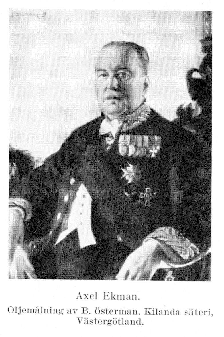 16. Axel Ekman, son till E. 11, f. 2 aug. 1869 på Finspångs slott, Risinge sn (ög.), d. 11 dec. 1939 i Stockholm (Osc). Studier för informator i hemmet; verkst. direktör i a.-b. Finspongs styckebruk 1893—1917; ordf. i styr. för Brandförsäkringsbolaget Göta och för Sjö- och brandförsäkrings a.-b. Svenska Veritas; led. av styr. för Lesjöfors a.-b. 1904–16; övertog Kilanda gård, Kilanda sn (Älvsb.) efter fadern 1904; godsägare på Mo gård, Risinge sn (ög.) från 1906; landshövding i Skaraborgs län 3 juli 1917–31 aug. (avskedet beviljat 15 juni) 1935. Talrika kommunala uppdrag i Risinge sn 1893–1917; led. av Östergötlands läns landsting 1896–1905 och 1910–16; led. av riksdagens andra kammare 1903–17 (led. av särskilda utskottet nr 2 1908, suppl. i statsutskottet 1906–08, led. av statsutskottet 1909–17, därav som v. ordf. 1912–13 och 1914B–16 samt ordf. 1917); led. av Östergötlands hushållningssällskaps förvaltningsutskott 1905–17; led. av järnvägsstyr:s organisationskommitté 1906, v. ordf. 1916; led. av sakkunniga för granskning av förslag till förvaltning av de permanenta verken i Boden m. m. 6 sept.–8 okt. 1909; suppl. för fullmäktige i riksgäldskontoret 15 mars 1910–14 maj 1912, fullmäktig 24 maj 1912–17 april 1918 (v. ordf. 11 maj 1916–4 jan. 1918); ordf. i vissa utredningar i anledning av den s. k. Södertäljekommissionens utlåtande 8 dec. 1911–16 jan. 1913; ordf. i järnvägspersonalkommittén 23 febr. 1912–20 dec. 1913; ordf. i tulltjänstemannakommittén 31 dec. 1912–2 sept. 1914; suppl. för järnvägsfullmäktige 1912–25; ordf. i styr. för statens uppfostringsanstalt å Bona 1914–17; v. ordf. i styr. för konungariket Sveriges stadshypotekskassa 25 maj 1915–1918; led. av pensionsfondskommittén 18 juni 1915–15 febr. 1916; av kassaförstärkningskommittén 8 juli 1916– 25 juli 1-916; led. av Östergötlands läns skogsvårdsstyrelse 1916–17; ordf. i tvångsuppfostringskommittén 21 maj 1918–22 april 1921; i lasarettsstadgekommittén 30 jan. 1920–1922; v. ordf. i Svenska trafikförbundet 1924–35; ordf. i Svenska mosskulturföreningen 1930. RVO 1897; RDDO 1898; RNO 1908; KVO2kl 1913; KVO1kl 1919; KNO1kl 1920; LLA 1922; KmstkNO 1927; GVrsJmt 1928; KmstkDDO 1932; Iqml 12.storl. s. å.; innehade flera andra utländska ordnar.