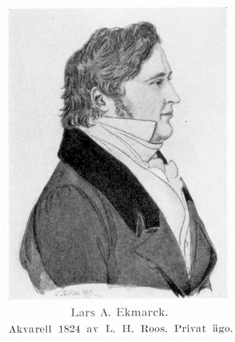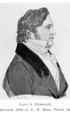 I den på sin tid bekanta brödratrion Ekmarck från Strängnäs var Lars eller, som han i den förtroligaste kretsen kallades, Lasse E. den mest kände. Utan att inneha någon särdeles betydande post i förvaltningen fick han genom sin ställning som »traducteur» i juridiska ärenden hos Karl Johan, som han högt beundrade, utmärkta förbindelser i ämbetsmannavärlden, något som även framgår av bevarade delar av E:s brevarkiv. Hans egentliga intresse låg likväl icke på det administrativt-juridiska fältet utan på litteraturens. Gemensamt med bröderna hade E. sålunda en utpräglat skönlitterär läggning och var därtill, liksom Jon E., musikalisk samt spelade själv piano. Måhända var det hans beröring i Uppsala med den Geijer–Silfverstolpeska kretsen, som stimulerade dessa intressen, överstinnan Malla skildrar i sept. 1817 E. som en livande sällskapsmänniska. Märkligt är att redan fem år tidigare finna E. i brevväxling med Tegnér. De hade träffats i Örebro och Tegnér var »bror» med E. Denne var redan i färd med planer på en vitter kalender, där han ville omtrycka Tegnérs lantvärnssång, men denne vägrade sin tillåtelse härtill på grund av den svenska politikens omsvängning. Vilket värde Tegnér eljest personligen satte på den unge E. framgår av brevets slutord: »Ville du någon gång hedra mig med några litterära underrättelser från Stockholm, så gjorde du mig ett stort nöje.» Sedan E. 1821 gjort ett förmånligt gifte med Dolly Martin, enda barn till den ene av de båda bekanta konstnärsbröderna Martin, bodde familjen om vintrarna i hennes hus, Regeringsgatan 37. Än mer bekant blev deras sommarbostad, lilla Rosenhill å Djurgården, vilket i vänkretsen förskaffade E. namnet »guvernören på Rosenhill».