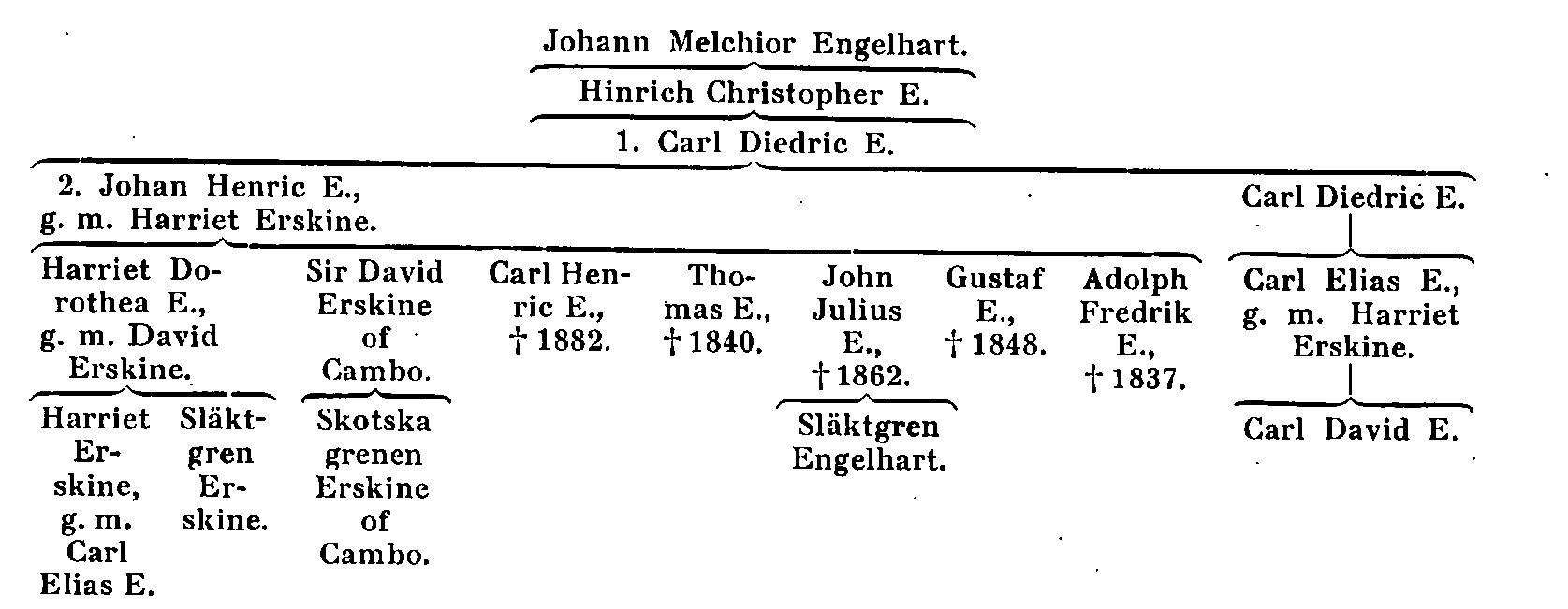 Professor Johan Henric E. äktade, såsom framgår av biografien nedan, 1787 Harriet Erskine, dotter utanför äktenskapet av brittiske konsuln i Göteborg Thomas Erskine, som 1793 blev sir Thomas Erskine, baronet, och 1799 earl of Kellie. Av J. H. Ers och Harriet Erskines nio till mogen ålder komna barn uppfostrades i Skottland Anna, Harriet Dorothea och Caroline E. samt äldste sonen David E. Då morfadern, lord Kellie, icke hade några barn i sitt äktenskap, adopterade han nämnde dotterson David E. och utverkade åt honom en till godset Cambo House i Fifeshire knuten baronetvärdighet 1821, varigenom denne David Engelhart blev sir David Erskine of Cambo (f. 1792, d. 1841). Om hans släktlinje, som alltjämt fortlever i Skottland och äger Cambo House, se släktart. Erskine. Sir Davids ena syster, den nämnda Harriet Dorothea E. (f. 1790, d. 1878), äktade 1812 David Erskine (f. 1787, d. 1860), illegitim son av sir David Erskine, lord Kellies äldre bror, samt själv affärsman först i Göteborg, sedan i Stockholm och Förenta staternas konsul i sistnämnda stad. I detta gifte (varom vidare se släktart. Erskine) föddes bl. a. dottern Harriet Erskine (f. 1816, d. 1850), g. 1850 med sin frände Carl Elias Engelhart (se ovan).