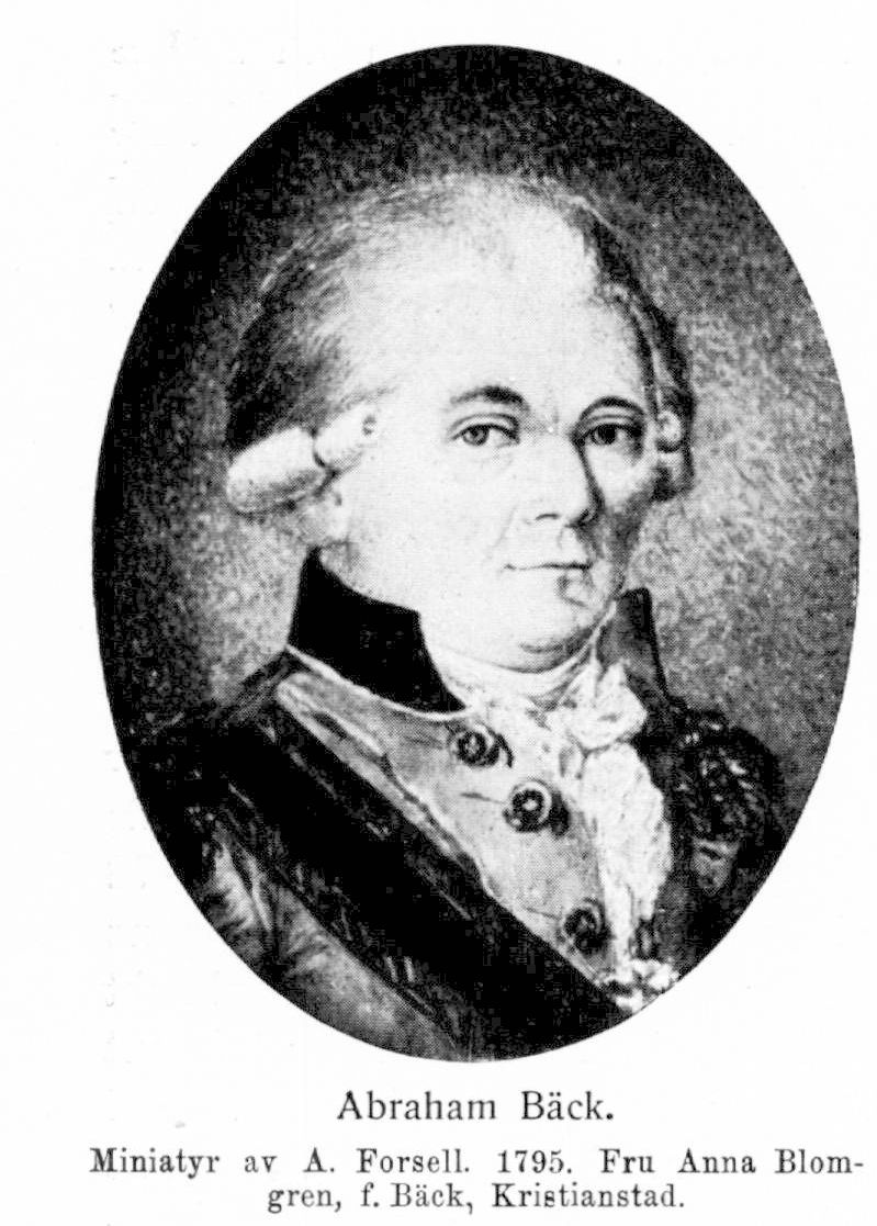 Bäck, Abraham, f. 16 juli 1742 i Karlskrona, d. 7 apr. 1822 därstädes. Föräldrar: assessorn Adam Johan Bäck och Helena Maria Ulf. Erhöll undervisning i hemmet; genomgick kadettskolan i Karlskrona; underkonduktör vid fortifikationen i Stockholm 21 dec. 1760; avlade fortifikationsofficersexamen 1761; höll offentliga föreläsningar i matematik i fortifikationskontoret i Stockholm 1761; konduktör (underlöjtnant) 26 aug. 1761; deltog i pommerska kriget 1761–62; placerad vid dock- och fästningsbyggnaden i Karlskrona 1762–72 och ånyo, efter kommendering till generallöjtnanten greve G, Spens armékår i Värmland 1772, 1773–84; erhöll konfirmationsfullmakt som konduktör 21 sept. 1763 (med tur från 26 aug. 1761); löjtnant 13 juli 1774; kapten 12 aug. 1776; fortifikationsbefälhavare i Karlskrona med avenyer på sjö- och landsidan samt Karlshamns kastell 1784–1820; major 26 sept. 1787 (uppger i senare meritförteckningar fullmakts datum 20 sept. 1781 och synes alltså, obekant när, ha erhållit förbättrad tur); överstelöjtnant i armén 25 aug. 1794; generalkvartermästarlöjtnant 7 apr. 1795; chef för Karlskronabrigaden 1801; överste i armén 28 maj 1801; överste i fortifikationen 1 mars 1805 (erhöll tjänstebrev 23 dec. 1808); chef för ingenjörkårens fortifikationsbrigad 13 aug. 1811; erhöll generalmajors titel 4 aug. 1815; erhöll K. resolution på livstids tjänstledighet med bibehållande av lönen 1 juni 1820. RSO 1797; LKrVA 1811; HedLKrVA 1821.