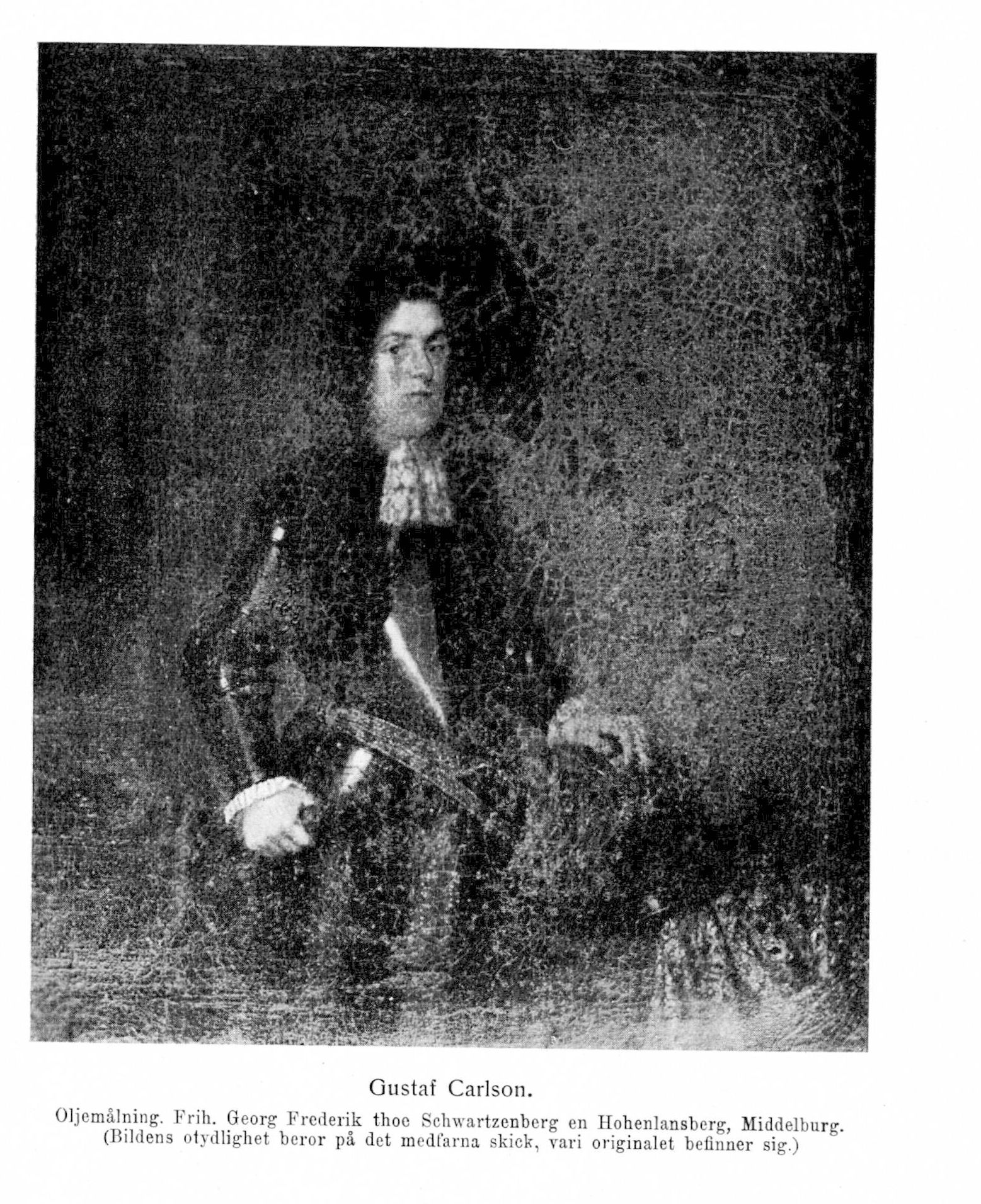 Carlson, Gustaf, f. 1647 i Stockholm, d. 1 jan. 1708 på slottet Ter-Hoorne i Friesland. Föräldrar: dv. pfalzgreven, sedermera konung Karl Gustav och Märta Allertz. Erkändes av fadern och vistades enligt stridande uppgifter hos Karl Karlsson Gyllenhielm eller sin faster Maria Eufrosyne De la Gardie; kom därefter till biskop Samuel Enander i Linköping; fick i slutet av år 1658 Erik Lindeman, sedermera Lindschöld, till informator och vistades med denne på resor från hösten 1659 till sommaren 1668; erhöll Börringe kloster och Lindholm i Skåne till sitt underhåll 6 okt. 1659; uppehöll sig i Strassburg 1660 (inskriven vid universitetet 20 mars)–febr. 1663, i Heidelberg febr. 1663–hösten 1664, i Sedan sept. 1664–våren 1666, i England och Holland 1666 och i Paris dec. 1666–okt. 1667 samt reste därefter i Italien; reste ånyo utrikes och inträdde i holländsk krigstjänst; överste för Upplands infanteriregemente 10 nov. 1673; kapten vid prinsens av Oranien livkompani 1674; greve 9 mars 1674; avreste 1675 till armén i Pommern; bevistade som kommendant i Wismar stadens belägring 1675 och utförde därefter ett flertal särskilda uppdrag; ledamot av kommissionen (generalkrigsrätten) angående översten B. K. Wrangels förhållande i striden vid Rathenow 31 mars 1676; överste för ett värvat regemente 3 apr. 1678; chef för prinsens av Oranien livregemente 1683; generallöjtnant i holländsk tjänst.