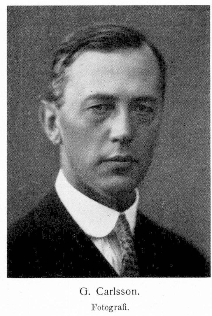 Carlsson, Gunnar Fredrik, f. 30 juni 1887 i Göteborg. Föräldrar: handlanden Max August Carlsson och Elära Gunnarsson. Elev i folkskolan 1893–97, vid Göteborgs västra realskola 1897–1902 och vid Göteborgs handelsinstitut 1902–26 maj 1904. Anställd hos skeppsredaren V. R. Lundgren i maj 1904 och övergick automatiskt i Rederi-a.-b. Transatlantics tjänst 27 maj 1904; praktiserade på skeppsredarekontor hos H. G. Harper & c:o i London 1906–07; återinträdde i tjänst hos Rederi-a.-b. Transatlantic 1907; kontorschef därstädes 1 jan. 1911, suppleant i bolagets styrelse 25 nov. 1912, ledamot av styrelsen från 18 nov. 1914 samt verkställande direktör i bolaget från 1 jan. 1915; ledamot av styrelsen för Rederi-a.-b Sverige—Nordamerika (från 1925 a.-b. Svenska Amerika linjen) från 30 nov. 1914 och av styrelsen för Sveriges ångfartygs assuransförening från 27 juni 1916 (ordförande från 1926); en av stiftarna av Försäkrings-a.-b. Atlantica 1916 och ledamot av dess styrelse från 15 sept. 1916 (v. ordförande från 1926); ledamot av styrelsen för a.-b. Göteborgs handelsbank, från 1919 a.-b. Nordiska handelsbanken, 1 dec. 1916–17 okt. 1925 samt en av stiftarna av a.-b. Göteborgs handelsbank 1925 och ledamot av dess styrelse från 12 okt. 1925; ledamot av styrelsen för a.-b. Götaverken från 11 dec. 1916; ledamot av tonnageanskaffningskommitterade 1916 (enligt K. bemyndigande 19 dec.)–26 sept. 1917; ledamot av styrelsen för Sjömannasällskapet i Göteborg från 7 mars 1917; ledamot av sakkunnige angående lotsverket 22 sept.–20 nov. 1917; svenskt ombud (jämte M. Wallenberg och H. Wrangel) för förhandling med de allierade om handels- och sjöfartsavtal 4 dec. 1917–29 maj 1918; ledamot av Göteborgs handelskammare från 1 jan. 1918; ledamot av styrelsen för Rederi-a.-b. Neptunus 4 okt. 1918–9 okt. 1919, av styrelsen för a.-b. Spetsbergens svenska kolfält 20 dec. 1918–7 nov. 1923, av styrelsen för a.-b. Svenska finansinstitutet (från 1920 Finansinstitutet svenska värden, emissions-a.-b.) 27 mars 1919–2 jan. 1926 och av styrelsen för a.-b. Värdeförvaltning 27 maj 1919–4 maj 1921; en av stiftarna av Återförsäkrings-a.-b. Vala 1919 och ledamot av dess styrelse från .28 jan. 1920 (ordförande från 1925); en av stiftarna av Göteborgs frihamns-a.-b. 1919 och ledamot av dess styrelse från 31 jan. 1920; v. ordförande i svenska kommittén för Lloyds register från 2 febr. 1920; ledamot av styrelsen för Färg-a.-b. International från 15 apr. 1920 (ordförande från 4 maj 1922); ledamot av styrelsen för Sveriges redareförening från 10 sept. 1920 (v. ordförande från 10 sept. 1920, ordförande från 25 sept. 1925) ocli av styrelsen för International shipping federation i London från 10 sept. 1920; ordförande i styrelsen för Göteborgs hamnarbetskontor från 21 sept. 1920; en av stiftarna av Svenska stenkols-a.-b. Spetsbergen 1921 och ledamot av dess styrelse 27 juni 1921–29 juni 1923; ledamot av styrelsen för a.-b. Hovas villastad från 29 apr. 1926 (ordförande från 1926); en av stiftarna av Rederi-a.-b. Trans-pacific 1926 samt ledamot av dess styrelse och verkställande direktör från 3 nov. 1926; ledamot av styrelsen för Rederi-a.-b. Transoil från 4 febr. 1927 (ordförande 1927) och av styrelsen för Nydqvist & Holm a.-b. från 9 apr. 1927. RNO 1918; RDDO 1923.