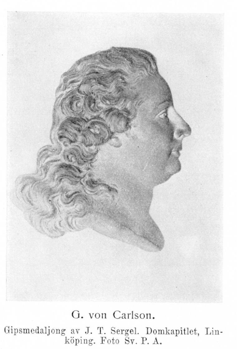 2. Johan Gustaf von Carlson, f. 15 nov. 1743 på Långbro i Vårdinge socken, d. 10 dec. 1801 i Stockholm, begraven i parken på Mälby. Föräldrar: kammarherren Johan von Carlsson och Maria Lovisin. Student i Uppsala 12 apr. 1760; erhöll testimonium academicum 10 dec. 1761. E. o. kanslist i krigsexpeditionen 27 maj 1762; avlade examen i kanslikollegiet 29 mars 1763; kopist 6 juni 1764; kanslist 13 juni 1765; andre protokollssekreterare 14 juli 1772; expeditionssekreterare 5 jan. 1773; erhöll förste sekreterares rang 11 okt. 1773; statssekreterare vid krigsexpeditionen 10 sept. 1781; ledamot av krigsberedningen 19 aug. 1783, av kommissionen angående kalktillverkning på Gotland 12 juli 1785–1787 (bet. ink. 20 maj), av kommissionen rörande tillökningen av sjöofficerarnas traktamente under expeditionen till Västindien 14 sept. 1785–16 febr. 1786, av kommissionen för undersökning av flottan sept.–11 okt. 1786 och av utredningskommissionen i Stockholm 23 maj 1788–31 dec. 1790; ledamot av rikets ärenders allmänna beredning 15 maj 1789, av hemliga krigsberedningen maj–sept. 1789 och av skogskommittén 22 jan. 1790–maj 1792; chef för krigsexpeditionens tredje avdelning vid expeditionens omorganisation 26 okt. 1790; ledamot av deputerade över förflutna utredningsanstalter 15 dec. 1790; president i Vasa hovrätt 6 apr. 1792 men tillträdde aldrig denna befattning; ledamot av en ny kommission angående skogsordningen 22 okt. 1792–nov. 1793; erhöll avsked från presidentämbetet 14 aug. 1794. Arkivarie vid K. M:ts orden 1776–82; RNO 1782; KNO 1787 och uppflyttades till följd därav i riddarhusets riddarklass; LVA 1787 (preses 1788 och 1797). — Ogift.