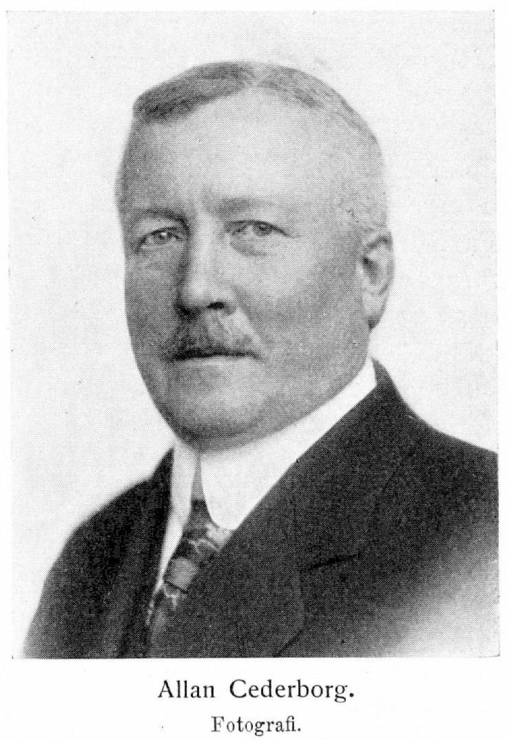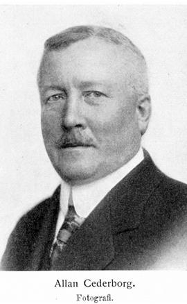 Cederborg, Allan, f. 9 nov. 1868 i Stockholm. Föräldrar: stadsfiskalen Per Cederborg och Sofia Albertina Björklund. Elev vid Maria elementarläroverk ht. 1878; avlade mogenhetsexamen vid h. latinläroverket å Södermalm 15 maj 1885; student i Uppsala ht. 1885; avlade hovrätts examen 14 dec. 1891. E. o. notarie i Svea Tiovrätt 18 dec. 1891 och vid Stockholms rådhusrätt 28 dec. 1891; e. o. tjänsteman i kommerskollegiet 16 febr. 1892–1902; kanslist (stenograf) i riksdagens första kammare 1893–95 och i dess andra kammare 1896–1907; erhöll första domareförordnandet vid Stockholms rådhusrätt 16 nov. 1893; stenograf hos stadsfullmäktige 1899–1906; sekreterare i löneregleringskommittén 19 nov. 1902–1 febr. 1908; styrelseledamot i a.-b. Arendska stenografinstitutet nov. 1903–30 jan. 1919; ordförande i tariffnämnden för de typografiska yrkena 1906–07; amanuens å aktuariekontoret i rådhusrätten 6 apr. 1906; tf. arkivarie vid rådhusrätten 8 juni 1906; ledamot av styrelsen för Stockholms stads arbetsförmedling för åren 1907–20 (v. ordförande 1907–10, ordförande 1911–20); statens förlikningsman i arbetstvister inom Mälarprovins ernås distrikt 31 dec. 1907–1 nov. 1918 och har tillika dels på grund av särskilda förordnanden, dels på grund av parternas uppdrag i stor utsträckning, tjänstgjort som förlikningsman vid arbetstvister; stadsnotarie på rådhusrättens fjärde avdelning 8 nov. 1907; stadsfullmäktig i Stockholm 1908–10 och 1 apr. 1911–31 mars 1927 och var därunder bl. a. ledamot av styrelsen för stadsfullmäktiges frisinnade grupp 1908–10 och 1911–27 (ordförande 1912–27), av kommittén för Industrimonumentet 21 maj 1908–19 okt. 1926, av löneregleringskommittén 7 dec. 1908–21 sept. 1909 (ledamot av arbetsutskottet) och av styrelsen för sjukhuset vid Långbro 1911–15, ordförande i lönenämnden 1911–28 apr. 1913, ledamot och sekreterare i rådhusrättskommittén 15 maj–25 nov. 1911, revisor i Stiftelsen konung: Oskar I: s minne från 1913, ledamot av beredningsutskottet 1913–20 (ledamot av avdelning B 1913–16, ordförande i avdelning A 1916–20 samt v. ordförande 1916–20) och av arbetarkommittén 30 maj,; 1913–1920 (ordförande 1917–20), ordförande i arbetslöshetskommittén 4 nov. 1914–3 juni 1918, ledamot av valkommittén 15 apr. 1915–31 mars 1920, stadsfullmäktiges v. ordförande 1 apr. 1915–31 mars 1920, ordförande i bostadskommittén 13 apr. 1916–1918-och i pantlånekommittén 5 febr. 1917–1920, ledamot av delegerade för spanska sjukan 31 mars 1919 och 26 jan. 1920, v. ordförande i. fastighetsnämnden 1919–20, ledamot av nämnden för dövstum-undervisningen i första distriktet från 1919, ledamot av stadshusdelegerade 16 apr. 1919–1922 och av bangårds delegerade 20 okt. 1919–1922, ordförande i ungkarlshotellkommittén 12 jan. 1920–19 dec. 1923, stadsfullmäktiges och stadskollegiets ordförande 1 apr. 1920–31 mars 1927, en av stadskollegiets delegerade för beredande av frågor rörande val 1920–30 juni 1922, ordförande i stadshusinvigningskommittén 31 aug. 1922–1923 och i dess verkställande utskott samt ledamot av delegerade för omreglerjng av överståthållare-ämbetet 3 dec. 1925–1927; tf. ledamot av rådhusrättens sjundeavdelning 1909–12; ledamot av centralstyrelsen för Stockholms frisinnade valmansförening (från 1923 Liberala föreningen i Stockholm) från 1910 (ordförande 1913–18 och från våren 1924); rådman 27 okt. 1911; ledamot av rådhusrättens femte avdelning 1911–12 och av dess fjärde avdelning 1912–18 (v. ordförande 1918); ordförande i statens bostadskommission 1911–18; ledamot av riksdagens andra kammare 1912–1914 A och 16 mars 1916–1917 och var därunder bl. a. ledamot av andra särskilda utskottet (ang. socialstyrelsen) 1912, av konstitutionsutskottet 1913, av särskilda utskottet (ang. allmän pensionsförsäkring) 1913, av lagutskottet 1914 A och1 av särskilda utskottet (ang. olycksfallsförsäkring) 1916; sakkunnig angående de mindre bemedlade klassernas bostadsförhållanden 19 jan. 1912–15 nov. 1918; styrelseledamot i Kooperativa bostadsföreningen Hemmet u. p. a. 1912; ledamot av kommittén för granskning av värnpliktiges ansökningar om befrielse från krigstjänstgöring dec. (enligt K. bemyndigande 1 dec.)–23 dec. 1914, av kommittén angående befrielse eller hemförlovning från viss värnpliktstjänstgöring maj 1915 (enligt K. bemyndigande 25 maj)–1 juli 1915, av kommittéerna för granskning av värnpliktiges befrielse från plutonchefsutbildning dec. 1915 (enligt K. bemyndigande 17 dec.) och juni 1916 (enligt K. bemyndigande 14 juni); ledamot av Frisinnade landsföreningens verkställande utskott 1915–17 och av föreningens förtroenderåd 1915–23 (v. ordförande 1917–23); biträdde i socialstyrelsen vid utarbetandet av förslag till lag angående främjande av arbetsfred, avgivet 13 juli 1916; inspektor för Katarina realskola från 25 maj 1917; ordförande i Svenska stadsförbundets bostadsråd 2 nov. 1917–28 aug. 1924; skattmästare i Svenska stadsförbundet från 7 sept. 1918, styrelsesuppleant därstädes 7 sept. 1918–2 sept. 1921 samt v. ordförande i förbundets styrelse från 2 sept. 1921; erhöll avsked (fr. o. m. 1 nov.) från rådmansbefattningen 18 okt. 1918; verkställande direktör i Stockholms stads brandförsäkringskontor från nov. 1918; ordförande bland sakkunnige angående kontinuerligt samarbete mellan Sverige, Norge m. fl. nordiska länder på det socialpolitiska området från 30 nov. 1918; ledamot i Sveriges delegation av den permanenta nordiska socialpolitiska delegationen m. m. 30 maj 1919–19 nov. 1920; styrelseledamot i Norrköpings enskilda bank 1920–23; ledamot av Sociala rådet från 1921; expert inom arbetslöshetskommissionen angående avstängning av arbetslösa från understöd vid arbetskonflikter 1921–22; sakkunnig angående åtgärde