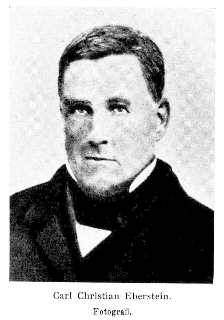 2. Carl Christian Eberstein, den föregåendes son, f. 23 mars 1794 i Lund, d. 16 mars 1858 i V. Karup (Krist.). Student (extranationalis) vid Lunds univ. 23 mars 1802; filol. kand. 6 dec. 1809; fil. kand. 5 dec. 1810; disp. pro exercitio 14 dec. 1808 och pro gradu mars 1811; fil. magister 21 juni 1811; docent i grekiska 21 april 1812; e. o. adjunkt i fil. fakulteten 14 sept. 1813; adjunkt i grekiska 12 juli 1815, allt vid Lunds univ.; erhöll genom K. brev 15 jan. 1817 tillåtelse att i stället för prästex. avlägga praesidii specimen över ett av Consistorium ecclesiasticum uppgivet teologiskt ämne men fick avslag på begäran att detta skulle få gälla även för pastoralex., till vars undergående E: s ålder icke heller berättigade honom; rektor vid Hälsingborgs läroverk 29 dec. 1819, tilltr. 11 febr. 1820; sökte professuren i romersk vältalighet etc. vid Lunds univ. s. å. och anförde besvär över att han ej uppförts på förslag, men besvären förföllo på grund av annan persons utnämning ; uppförd å 3: e förslagsrummet till professor i teoretisk filosofi där; professors namn 14 nov. 1821; erhöll genom K. brev 25 april 1822 rätt att, då han nu uppnått tjuguåtta år, i stället för präst- och pastoralex. utgiva och presidera för en latinsk avhandling i av Consistorium ecclesiasticum uppgivet teologiskt ämne; prästvigd i.Stockholm 29 juli 1823; kyrkoherde i Visseltofta och Verum 5 juni 1824, tilltr. 1 maj 1826, ir>st. 7 okt. 1827; prost över egna församlingar nov. 1827; som 4:e provpredikant utnämnd till kyrkoherde i V. Karup och Hov 30 maj 1835, tilltr. genast; uppförd två gånger på 1: a förslagsrum till Landskrona pastorat, vidare på förslag till Åsums, Jämshögs,. Glimåkra och St. Råby pastorat; 1: e provpredikant i Jönköpings stadsförsamling 1826 samt uppförd på 2: a förslagsrum till Klara församling i Stockholm 1832, på 1: a till Jakobs och Johannes där 1853; förklarades av. Consistorium ecclesiasticum 28 mars 1855 sitt ämbete förlustig men överklagade domen, målet återförvisades av Göta hovrätt till häradsrätten, där rättegången pågick ännu vid E: s död. G. 24 juni 1817 i Härs-lövs sn (Malm.) m. Ingrid Catharina Urseli, f. 16 okt. 1795 i Välluvs sn (Malm.), d. 24 maj 1879 i Uddevalla, dotter av kronolänsmannen Olof Urseli och Hanna Olsdotter.