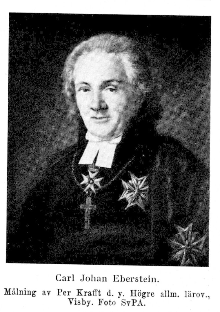 1. Carl Johan Eberstein, f. 28 sept. 1758 på Hansta, V. Vingåkers sn (Söd.), d. 20 jan. 1838 i Visby. Föräldrar: titulärprofessorn, häradsprosten Carl Christian Eberstein och Anna Margaretha Heyn. Student vid Lunds univ. 23 juli 1772; disp. 30 juni 1777 i Greifswald och fil. mag. där s. å.; docent i teologi 29 okt. 1779; notarie i teol. fak. 20 mars 1780; teol. adjunkt och prästvigd 22 sept. 1784; kyrkoherde i Hällestads, Dalby och Bonderups pre-bendeförsamlingar 1789; prost 25 aug. 1790; kyrkoherde i Husie och V. Skrävlinge församlingar 1795; kontraktsprost i Oxie härad 1799 (avlade ed 28 maj); teol. doktor i Uppsala 1 nov. 1800; uppförd på tredje förslagsrummet till biskop i Lund 29 okt. 1803; kontraktsprost i Bara härad 1805; tredje teol. professor i Lund, tillika kyrkoherde i Vallkärra och Stångby prebendeförsamlingar 15 jan. 1808; uppförd på andra förslagsrummet till biskop i Lund 5 juli 1811; kontraktsprost i Torna härad 9 jan. 1812; förste teol. professor och domprost i Lund 30 sept. s. å.; biskop över Gotlands stift 7 juli 1813; bevistade riksdagarna i Stockholm 1815 och 1817—18 (led. av bankoutskottet); LNO 1814; KNO 1837; led. av Evangeliska sällskapet och Bibelsällskapet i Stockholm.