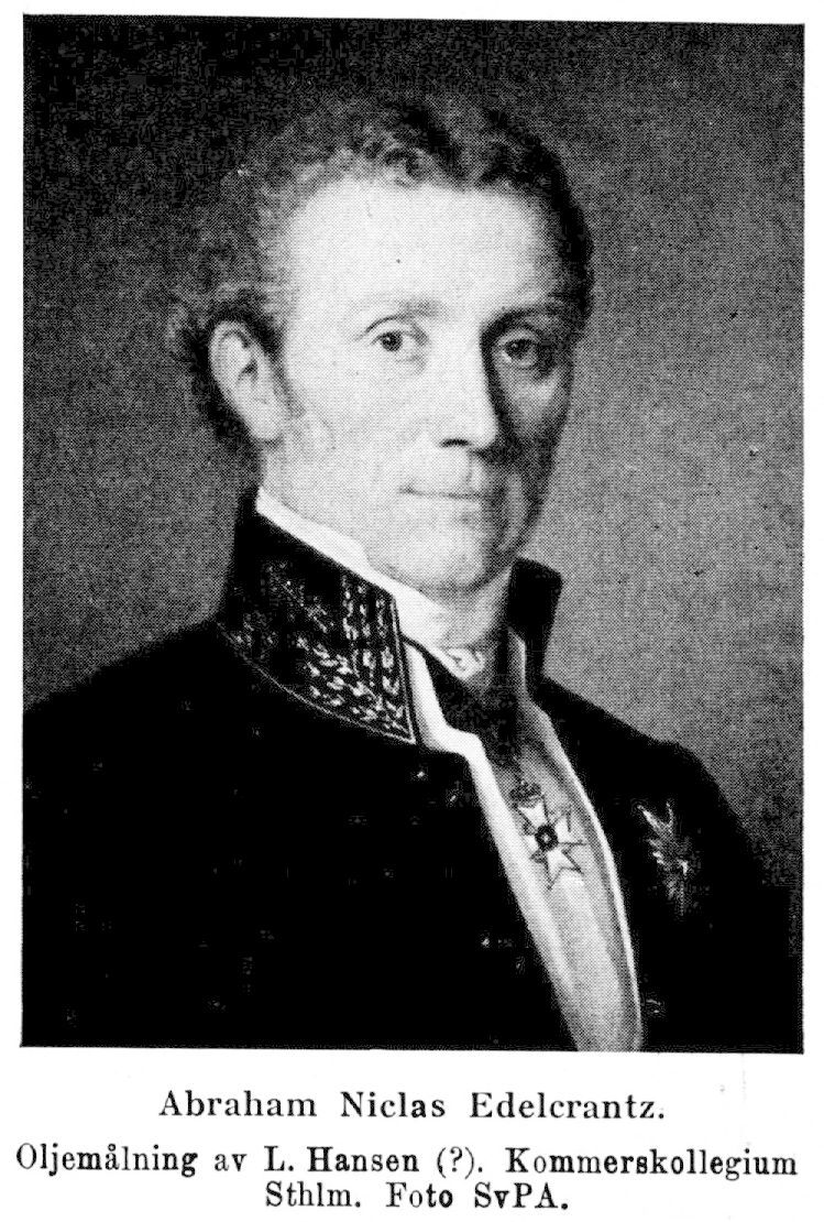 Edelcrantz, Abraham Niclas (före adlandet Clewberg), f. 29 juli 1754 i Åbo, d. 15 mars 1821 i Stockholm (Klara). Föräldrar: professorn vid Åbo akademi Carl Abraham Clewberg och Agatha Charlotta Fahlenius. Student vid Åbo akademi 1766; disp. pro exercitio 12 juni 1771 och pro gradu 18 juli 1772; fil. magister i Åbo 22 juli 1772; docent i naturkunnighet och litteraturhistoria vid Åbo akademi 25 febr. 1773; amanuens hos Åbo akademis konsistorium 1776; uppdrag att ordna konungens handbibliotek s. å.; e. o. fil. adjunkt vid Åbo akademi 16 okt. 1778; bibliotekarie där 15 mars 1780–94; tillerkändes tur till professorslön 1783 och erhöll titel av K. protokollssekr. 23 sept. s. å.; förvaltare av konungens handkassa och andre direktör vid de K. teatrarna s. å.; handsekr. hos Gustav III 31 maj 1787; led. av Generaltulldirektionen 17 okt. s. å.; adlad 28 april 1789 och introducerad 7 nov. s. å.; teaterstudier i England, Frankrike och Tyskland 1790; kansliråds titel 12 nov. 1793, ord. kansliråd 7 nov. 1794; arkivarie vid K. M:ts orden 24 nov. s. å.; företog på officiellt uppdrag en utländsk studieresa 1801–04: förste direktör för de K. teatrarna 16 okt. 1804; överintendent och preses för Konstakademien och dess skolor 5 maj 1805; ordf i direktionen för Allmänna brandförsäkringsfonden 5 maj s. å.; led. av K. hovstall- och kasernbyggnadskommittén 26 juni s. å., av teaterkommittén 1 dec. s. k., led. av Kungshusbyggnadskommittén 19 mars 1807; anförtroddes högsta ledningen av telegrafväsendet 25 april 1808; tf. hovkansler 30 juni 1808 och som sådan led. av den då tillförordnade regeringen; bevistade som led. av ridderskapet och adeln riksdagarna 1792, 1800, 1809–10, 1812, 1815 samt 1817–18, led. av konstitutionsutskottet och opinionsnämnden 1812 och av allmänna besvärs- och ekonomiutskottet 1817–18, av konstitutionsutskottets tryckfrihetsberedning 4 juni 1812; ordf. i kommittén för salpetertillverkningens upphjälpande 22 mars 1811, i kommittén för införande av de Congrewska raketerna 4 april s. å.; led. av kommittén för skråförfattningarnas överseende 30 sept. 1812; direktör i Lantbruksakademien 3 dec. s. å. till sin död; president i Kommerskollegium 24 april 1813; friherre 9 maj 1815; ordf. i kommittén för organisation av den civila pensionsinrättningen 22 nov. s. å.; beviljades privilegium exclusivum på en av honom utförd ångmaskinskonstruktion 20 febr. 1816; ordf. i kommittén för inrättandet av en postjaktsfart med ångbåt mellan Ystad och Stralsund 5 febr. 1817; ordf. i myntkommittén 18 juni 1817, i manufakturredskapskommittén; led. av Utile Dulci 1776; en av de aderton i Svenska akademien 2 dec. 1786; LMA 1788; LVA 1797, dess preses 1798; led. av Patriotiska sällskapet 23 dec. 1799, dess ordf. 1800 och 1812; RNO 1800; led. av Die Gesellschaft Naturforschender Freunde i Berlin 1802, La Societé d'Encouragement pour l'Industrie nationale och La Societé d'Agriculture i Paris 1803, The Royal Institution of Great Britain i London s. å., The Board of Agriculture och The Society for the Encouragement of Arts, Manufactures and Commerce i London s. å.; LFrKA 1805; arbetande LKrVA 1806; KNO 1808; HedLHA s. å.; arbetande HedLKrVA 1811; LLA 1812; HedLFS 1815. – Ogift.