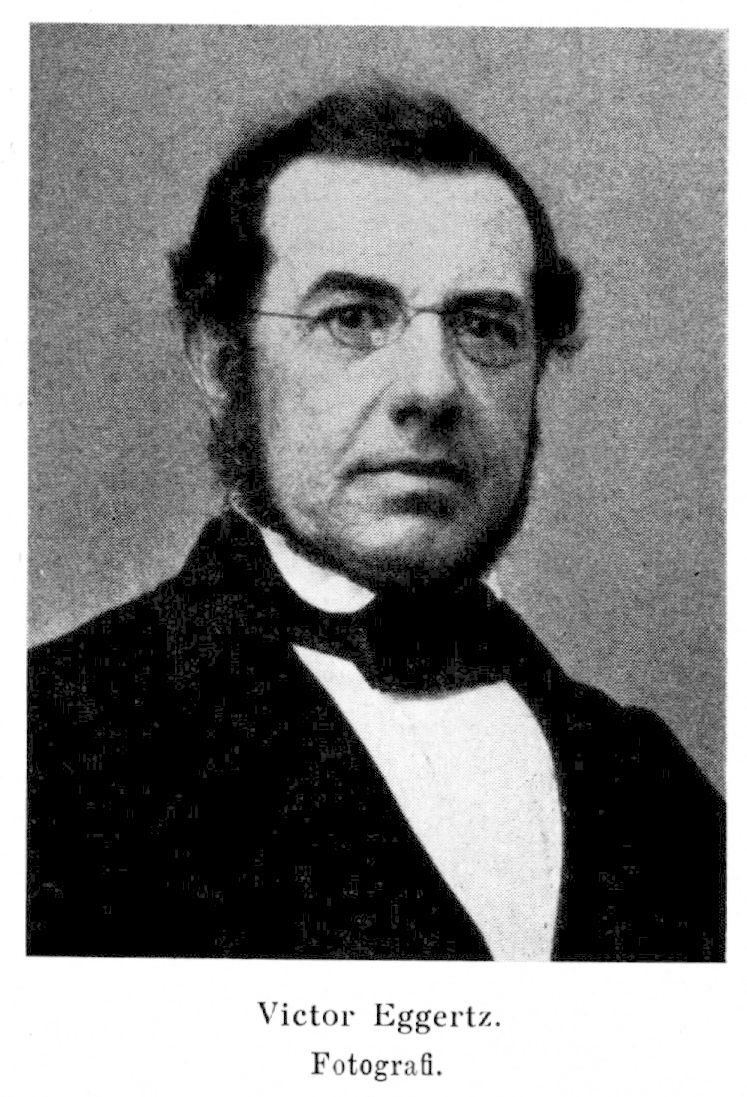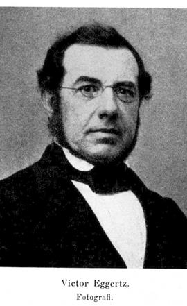 2. Victor Eggertz, f. 16 okt. 1817 på gården Morbygden, Stora Kopparbergs sn (Kopp.), d. 16 aug. 1889 i Stockholm (Ad. Fr.). Föräldrar: bergsrådmannen Daniel Eggertz och Eva Elisabeth Erlandsson. Elev i Falu skola 1826–27 och i Västerås gymnasium; student vid Uppsala univ. 25 okt. 1836; hovrättsex. där 3 juni 1839; e. o. kanslist i justitiefördelningen av K. M:ts kansli s. å.; elev vid Falu bergsskola 1840–41; bergsex. i Uppsala 1845; auskultant i Bergskollegium 6 maj s. å.; stipendiat vid bergsskolan 15 maj s. å.; avgångsex. som ordinarie elev från Falu bergsskola 1846; stipendiat å Jernkontorets masmästarestat 1847; tjf. övermasmästare i Västmanland och Dalarna 1847–52; disponent vid Limå järnbruk i Dalarna 1851–53; professor, föreståndare och förste lärare vid Falu bergsskola med undervisningsämnena kemi, proberkonst och metallurgi 20 sept. 1853 och, när bergsskolan flyttades till Stockholm och förenades som fackskola med Teknologiska institutet, transporterad och förordnad till professor i metallurgi och hyttkonst vid Teknologiska institutet (sedermera Tekniska högskolan) 9 april 1869; avsked med pension från dessa befattningar 6 sept. 1883 med tillstånd att fortfarande få begagna bergsskolans materiel för fullföljandet av sina trettioåriga arbeten för utarbetandet av enkla analysmetoder för malmer; styr.-led. av Teknologiska institutet 2 juni 1868–9 juni 1877; led. av kommittén för avgivande av förslag till bestämmelser i avseende på lärokurser m. m. i sammanhang med bergsskolans organisation 10 aug. 1866; led. av kommittén för utredande av frågan om utvidgning av laboratoriebyggnaderna vid Teknologiska institutet 20 sept. 1875; juryman vid utställningen i Stockholm 1866; bergsvetenskapliga studieresor i Norge, Tyskland, Österrike, Frankrike, Belgien och England; erhöll Jernkontorets stora medalj i guld 1852; RNO 1868; LLA 1870; LVA 1874 och i dess redaktionsutskott 1876–85.