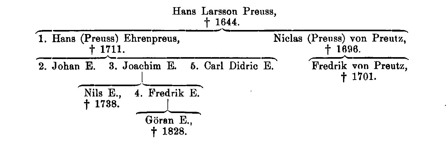 Ehrenpreus, släkt. Hans Larsson Preuss (Preutz, Prytz), som av Kammarkollegium i april 1632 förordnades till myntinspektor i Nyköping och 1638 blev justitieborgmästare där (d. 1644), hade bl. a. två söner, som adlades med olika namn. Den yngre av dessa, Niclas Preuss, adelsman 1678 med namnet von Preutz (f. 1639, d. 1696), fick 1665 burskap som handlande i Göteborg och hade vidlyftiga affärer med kronan, särskilt som leverantör till armén och flottan. Han försåg 1669–70 garnisonen i Göteborg med klädespersedlar, namnes 1671 som vinimportör av »sköna och oförfalskade drycker» och var en av de ledande inom den göteborgska sjöfarten. Under danska kriget gjorde han stora försträckningar till kronan (jfr nedan s. 301) och blev 1676 kommissarie vid flottan i Göteborg samt tillika assessor vid amiralitetet där, fick avsked 1680 och erhöll kommerseråds titel 1690. Ätten utgick på manssidan redan med hans son löjtnanten Fredrik von Preutz (f. 1675, d. 1701), som avled av sina vid Narva undfångna blessyrer. Han är känd som skald; en hans dikt från 1700 är tryckt av Sigrid Leijonhufvud i Ord och Bild 1900. – En Hans Larsson Preuss' äldre son var rådmannen i Stockholm, faktorn i Arboga och Örebro, tituläre överinspektören Hans Preuss, som 1694 (ej 1695) adlades med namnet Ehrenpreus (E. 1). Bland dennes barn i första giftet voro sönerna överdirektören vid Stora sjötullen, bruksägaren Johan (Hans) E. (E. 2) och överdirektören vid gevärsfaktorierna Joachim E. (E. 3), den sistnämnde i sin tur fader till faktorn vid Jönköpings gevärsfaktori Nils E. (se s. 312 nedan) samt överdirektören vid nämnda gevärsfaktori Fredrik E. (E. 4); om dennes son Göran E. se s. 320 nedan. Den adliga grenen utdog med en dennes sonson 1848. En son till överinspektören Hans (Preuss) E. i hans tredje gifte var riksrådet och universitetskanslern Carl Didric E. (E. 5), som 1747 blev friherre samt 1751 greve (som sådan ej introducerad) och själv slöt sin gren av ätten.