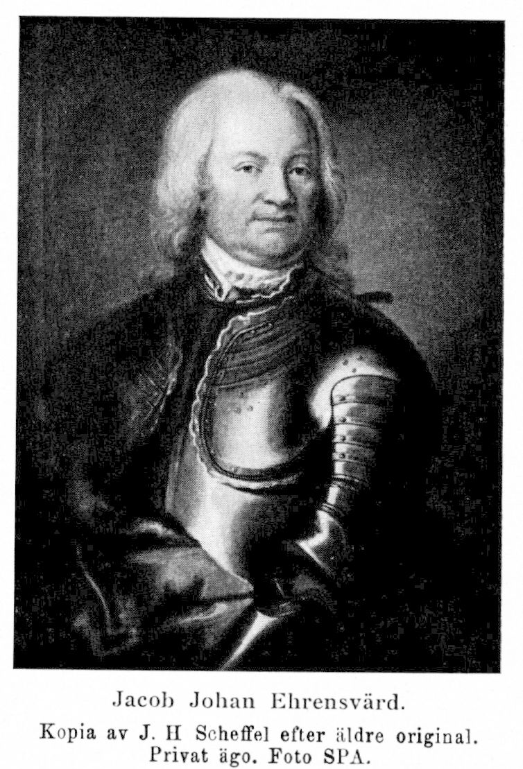1. Jacob Johan Ehrensvärd (före adl. Schäffer), f. 11 maj 1666 (likpredikan, gravsten, huvudbanér) i Finland, d. 17 okt. 1731 på Karlstens fästning i Marstrand. Föräldrar: Petter Schäffer (se släktart.) och Maria Hein. Lärkonstapel vid artilleriet i Narva 1685; styckjunkare där 1700; fänrik 11 maj 1701; löjtnant 20 dec. 1704; fången vid Perevolotjna 1 juli 1709 men fick hempermission och blev s. å. utväxlad; löjtnant vid artilleriet i Stockholm 29 sept. 1709; kapten vid den för kriget i Skåne nyuppsatta fältartilleristaten 4 jan. 1710; artillerimajor i Göteborg 19 mars 1712; konfirm.-fullmakt 31 mars 1713; major vid artilleriet i Wismar 26 sept. s. å.; överstelöjtnant 24 jan. 1715; befälhavare för fältartilleriet i Skåne 1716; adlad 20 nov. 1717, men sköldebrevet ej utfärdat förrän 4 jan. 1720; överste och kommendant på Karlstens fästning 6 nov. 1719.
