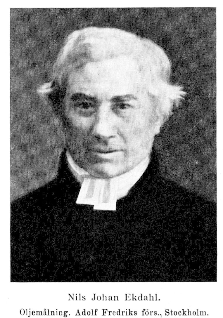 Ekdahl, Nils Johan, f. 27 april 1799 i Fågeltofta sn (Krist.), d. 20 dec 1870 i Stockholm (Ad. Fredr.). Föräldrar: åbon å Tjörnered Jöns Nilsson och Christina Olsdotter. Student vid Lunds univ. 3 juni 1820; prästvigd i Lund 22 dec. 1822 till pastorsadjunkt i Fjälkinge; pastorsadjunkt i S:t Ibb 18 juni 1823, i Görslöv och Särslöv 30 dec. 1824 samt i Bara och Mölleberga 14 dec. 1825; erhöll 14 mars 1827 sex månaders tjänstledighet från 1 april s. å. för att med statsunderstöd företaga forskningsresor i Norrland (1827–30), »förnämligast med avseende på historien och antikviteterna»; amanuens hos K. samfundet för utgivande av handskrifter rörande Skandinaviens historia 29 .okt. 1830–38; svensk kommissarie i Kristiania 1832–33 vid verkställande av delning och avskrivning av de historiska handlingar (»Münchensamlingen»), som konungen av Bayern skänkt konungen av Sverige och Norge; pastoralex. i Lund 20 juli 1833; bataljonspredikant vid Svea livgarde 28 sept. 1833; vice predikant vid Norra korréktionsinrättningen i Stockholm 16 mars–30 april 1836; predikant vid Djurgårdens hälsobrunn sommaren 1836; kyrkoherde i Adolf Fredriks regalt-patronella pastorat i Stockholm 30 april 1838, tillträdde 1 maj s. å.; led. av K. direktionen över Stockholms stads undervisningsverk 13 okt. 1846–31 dec. 1869; åtalad för att mot. giftomans förbud ha sammanvigt två kontrahenter och av Stockholms stads konsistorium dömd 19 okt. 1849 att mista prästämbetet; domen fastställd av Svea hovrätt 15 febr. 1850, men K. M:t nedsatte 20 dec. 1850 av gunst och nåd straffet till sex månaders suspension; därpå av konsistoriet suspenderad 17 jan. 1851 för sex månader; kallad att provpredika för kyrkoherdetjänsten i Sala stads- och landsförsamlingar 1837 och för kyrkoherdetjänsten i Nikolai i Stockholm (pastor primarius) 1841; statsrevisor 1841 och 1845. KorrespLHA 1827; LSkS 1838.