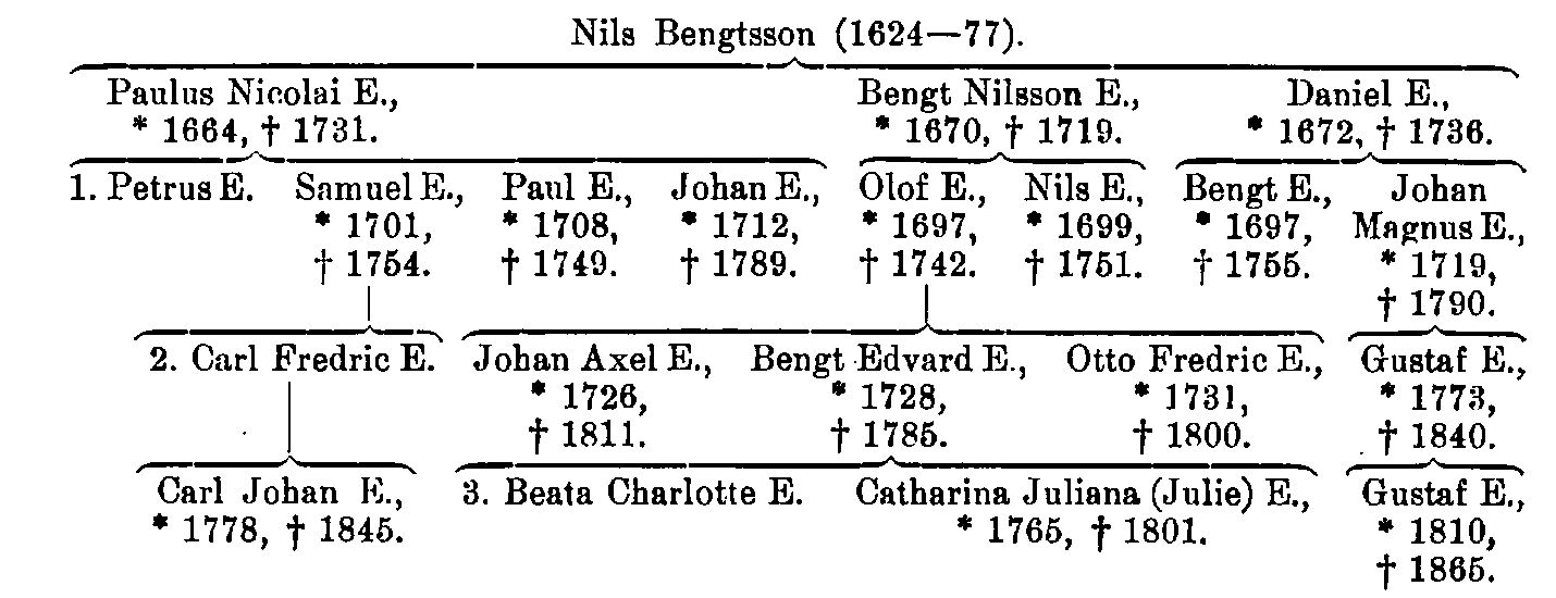 Källor: om släkten i sin helhet se: Ebbe Ekermanns samling, Stockholms stadsarkiv; Svenska släktkalendern, 7, 1919, utg. av G. Elgenstierna, samt [V. Örnberg], Svensk slägtkalender, 4, 1888 (1887). – Om de olika riksdagsmännen E. se V. Millqvist, Svenska riksdagens borgarstånd 1719–1866 (1911) – om Carl Johan E. även H. A. Olsson, Ministerstyrelse- och kollegialprinciperna i svensk reformdiskussion 1812–40 (1934); om de i Linköping bosatta släktmedlemmarna se A. Kugelberg, Gamla Linköpingsgårdar (1943), samt S. Kraft, F. Lindberg, A. Kugelberg m. fl, Linköpings historia, 2:2 (1946). – Om Charlotte och Julie E. sé bl. a.: Brev till Carl Sparre från A. v. Axelson, R. F. Hochschild, E. Palmstedt och H. v. Sivers-Liljensparre 1773–1790, utg. av Torgny Höjer & N. Staf (Hist. handl. 32:2, 1942); G. J. Ehrensvärd, Dagboksanteckningar förda vid Gustaf III:s hof, utg. af E. V. Montan, 1–2 (1877–78); F. A. von Fersen, Historiska skrifter, utg. af A. M. Klinckowström, 4–5 (1869–70); C. Forsstrand, Sophie Hagman och hennes samtida (1911), s. 138–171 [Charlotte E.]; R. F. Hochschild, Memoarer, utg. af H. Schuck, 1 (1908), s. 62, 95 f, och 2 (1909), s. 79, 223. – H. L. von Dardel, En borgmästarefru i Linköping vid slutet av 1700-talet [Julie E.] (Personhist. tidskr, 28, 1927, tr. 1928).