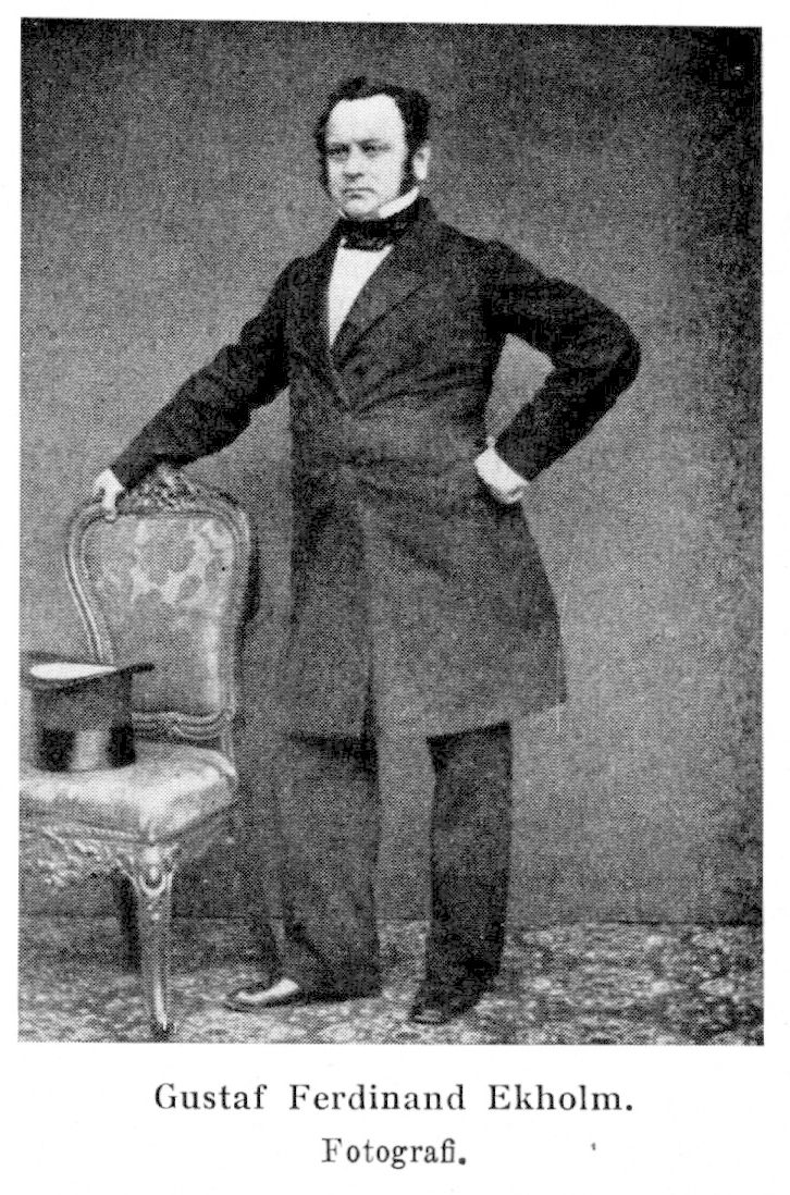 2. Gustaf Ferdinand Ekholm, f. 13 dec. 1803 i Västerås, d. 15 maj 1865 där. Föräldrar: lagmannen och borgmästaren där Anders Ekholm och Beata Sofia Wulff. Student vid Uppsala univ. 1.9 okt. 1821; jur. utr. kand. där 1 mars 1.828; kopist, i Hovkanslersexp. 13 juni 1827–31; borgmästare i Västerås 27 okt. 1832; led. av borgarståndet vid riksdagarna 1840–41, 1844–45, 1847–48, 1850–51, 1853–54, 1856–58, 1859–60, 1862–63, led. av lag- och konstitutionsutskotten m. fl. utskott.
