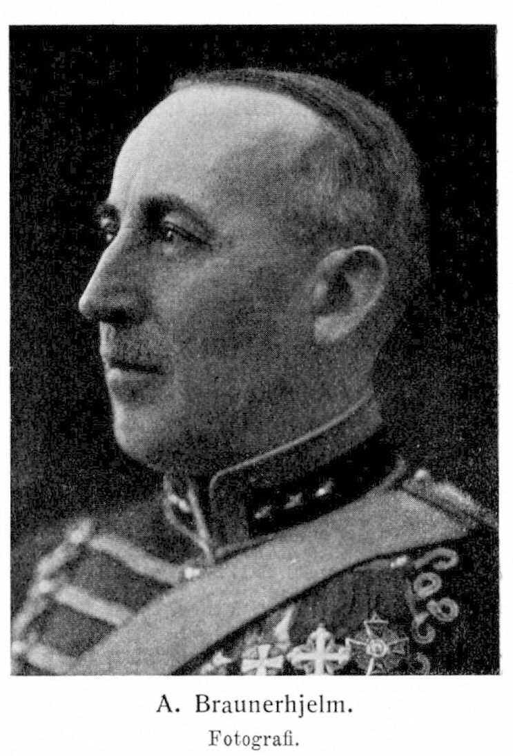 2. Carl Axel Georg Braunerhjelm, f. 8 febr. 1872 på Hjulsta i Enköpings-Näs församling. Föräldrar: överstelöjtnanten Karl Gustav Georg Braunerhielm och Adelaide Emilia Ebba Ulrika Sparre. Åtnjöt privat undervisning; elev vid Beskowska skolan ht. 1883–vt. 1888; studerade vid Philp och Hellgrens privata institut ht. 1888–1889; avlade mogenhetsexamen som privatist vid Nya elementarskolan i Stockholm 18 maj 1889; volontär vid livregementets dragonkår 26 maj. s. å.; elev vid krigsskolan å Karlberg 28 juli 1890; avlade officersexamen 28 okt. 1891; underlöjtnant i livregementets dragonkår 13 nov. s. å.; elev vid ridskolan 1 okt. 1892–30 sept. 1893; arrenderade Stockholms nya ridinstitut 1892–98; elev vid krigshögskolan 24 sept. 1896–12 juli 1898; andre regementsadjutant 19 nov. 1898–30 mars 1899; underlöjtnant vid livregementets dragoner 3 dec. 1898; löjtnant i armén 3 mars 1899; intendentsaspirant 4 mars–17 sept. s. å.; anställd vid statens järnvägar för stakning av banan Gällivare—Riksgränsen 4 apr.–15 nov. s. å.; löjtnant i regementet 14 apr. 1900; kommenderad i lantförsvarsdepartementets kommandoexpedition 1 apr.–30 sept. 1902; subalternofficer och lärare vid krigsskolan 2 okt. s. å.–30 nov. 1906; löjtnant vid regementet av 2kl 13 mars 1903 och av 1kl 1 juli 1904; elev vid skjutskolan 30 juni–19 aug. 1905; regementskvartermästare 23 aug. 1907–31 okt. 1909; ryttmästare i livregementets dragoner 1 maj 1909; placerad som chef för femte skvadronen av livregementets dragoner 11 mars 1910–1 maj 1915; ryttmästare av 2kl vid regementet 4 juli 1910; genomgick taktisk kurs för kaptener (ryttmästare) 1911; kommenderad vid chefens för sjätte arméfördelningen stab under försöksmobilisering i Umeå sept. 1912; ryttmästare av 1kl vid regementet 19 mars 1915; befälhavare för kavalleriets officersaspirantskola i Eksjö 26 juni s. å.–4 juni 1916; major i armén 5 nov. 1915; tf. major vid fördelningskavalleriet med tjänstgöringsskyldighet vid livregementets husarer 1 jan. 1916; kommenderad till skjutskolans kurs för majorer och kaptener (ryttmästare) maj–juni 1917; överstelöjtnant vid fördelningskavalleriet med tjänstgöringsskyldighet vid livgardet till häst 22 febr. 1918; överste och chef för kronprinsens husarregemente 30 nov. 1920. RSO 1912; KSO2kl 1924; innehar dessutom utländska ordnar.