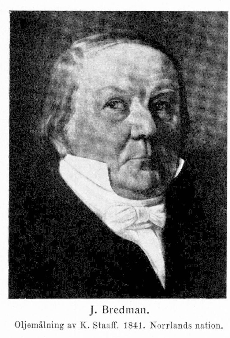 Bredman, Johan,f.7 nov. 1770 i Oviken, d. 3 febr. 1859 i Uppsala. Föräldrar: furiren Erik Bredman och Anna Maria Löfberg. Student i Uppsala 16 mars 1790; disp. 7 juni 1794 (Annales typographici seculi decimi sexti in Svecia, p. 4; pres. E. M. Fant); fil. kand. 5 apr. 1797; disp. 19 apr. s. å. (De ambiguitate radicum algebraicarum in problematibus physicis; pres. Sak. Nordmarck); fil. magister 13 juni s. å. Uppförd på tredje förslagsrummet till adjunkt i matematik 26 nov. 1800; docent i matematik i Uppsala 5 jan. 1801; amanuens vid observatoriet 1802; bestred de offentliga föreläsningarna i astronomi ht. s. å., ht. 1809 och vt. 1810, sistnämnda år tillika med examensskyldigheten, samt i matematik ht. 1808; matheseos och philosophias naturalis adjunkt 22 dec. 1808; uppförd å andra förslagsrummet till professuren i lägre matematik 24 nov. 1810; professor i astronomi 12 aug. 1811; inspektor för medelpad-jämtländska (från ht. 1827 norrländska) nationen i Uppsala 1816–41; erhöll avsked som professor emeritus 6 aug. 1841. LVA 1815; LVS s. å.; RNO 1832; fil. jubelmagister 16 juni 1848. — Ogift.