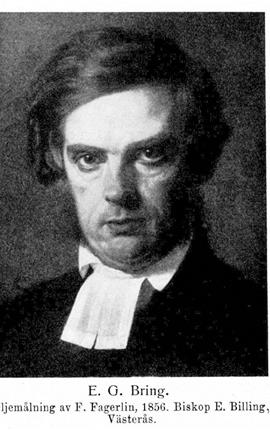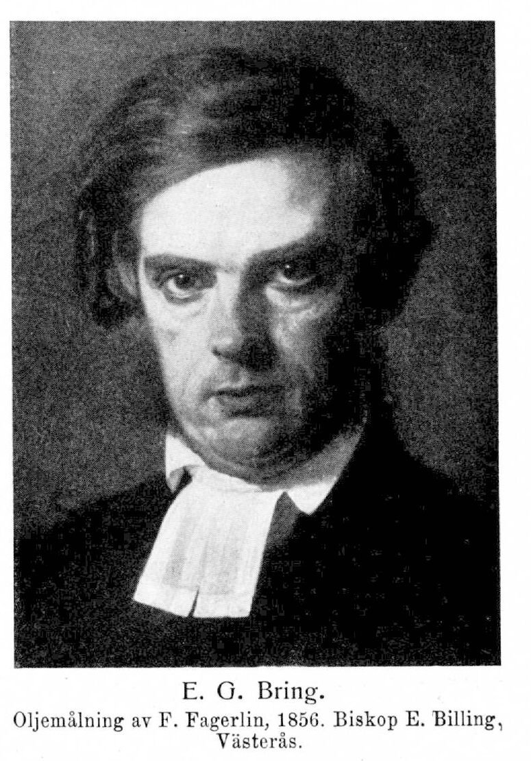 3. Ebbe Gustaf Bring, den föregåendes sysslings son, f. 4 juli 1814 i Askersund, d. 12 aug. 1884 i Linköping. Föräldrar: stadsläkaren i Askersund assessorn Sven Håkan Bring och Ulrika (Ulla) Sofia Silfverswärd. Åtnjöt privat undervisning; student i Uppsala 23 okt. 1829 och i Lund 5 dec. 1832; filol. kand. 31. dec. 1833; disp. 27 apr. s. å. (Om de fordna skandinavers näringsfång och hushållning, st. 1; pres. E. S. Bring); fil. kand. 30 maj 1835; disp. 16 juni s. å. (Jemförelse emellan statsförfattningens utveckling hos romarna och hos de germaniska i synnerhet de skandinaviska folken, III; pres. E. S. Bring); fil. magister 23 juni s. å.; avlade teol. teoretisk examen 5 apr. 1837, teol. praktisk examen 18 dec. s. å. samt prästexamen 19 dec. s. å.; prästvigd 20 dec. s. å.; företog med offentligt understöd en resa till Tyskland i teologiskt vetenskapligt syfte sommaren 1851. Biträdande föreståndare för en privatskola 1835–41; docent i dogmatik och moralteologi vid Lunds universitet 31 aug. 1837; examinator inom teologiska fakulteten ht. s. å.–vt. 1844; förordnad att hålla offentliga föreläsningar i moralteologi och dogmatik vt. 1838–vt. 1841; tf. professor i samma ämnen ht, 1841–vt. 1842; examinator i studentexamen i teologi från ht. 1842; en av de äldsta åtta docenterna 1 maj 1843; notarie i teologiska fakulteten från juni 1844 till början av 1847; tf. professor i pastoralteologi från ht. 1844 o.ch i exegetisk teologi halva vt. 1847; examinator i homiletik och kateketik från ht. 1844; andre teologie adjunkt och kyrkoherde i Stångby och Vallkärra 29 nov. s. å.; prost över egna församlingar 30 nov. s. å.; ledamot av styrelsen för Lunds missionssällskap vid sällskapets stiftande 3 juli 1845, sekreterare s. d.–8 maj 1854, v. ordförande 1 nov. 1847 och ordförande 3 maj 1852–8 maj 1854 samt ånyo 2 juli 1855–5 maj 1862; uppförd å andra förslagsrummet till professor i pastoralteologi 8 jan. 1847; professor i samma ämne samt kyrkoherde i Hällestad, Dalby och Bonderup 4 maj 1848; ledamot i kommittén angående nya predikotexter 6 juli 1849–3 aug. 1850; transporterad till kyrkoherde i Uppåkra och Flackarp 1850; ledamot i kommittén angående ny kyrkohandbok och katekesförklaring 9 juli 1852 (avgav förslag till ny kyrkohandbok 1854 och reviderat, förslag till dylik 1 nov. 1855 samt förslag till ny katekes 5 juni 1856 och senare förklaringar); fullmäktig för Lunds stifts prästerskap vid riksdagarna 1853–54 och 1856–58; deltog i utgivandet, av Svensk kyrkotidning 1855–63; uppförd å tredje förslagsrummet, till biskop i Lund 21 apr. 1856; förste teologie professor och domprost i Lund 22 aug. s. å.; Lunds universitets rektor s. å.– 1857; biskop i Linköping 15 juni 1861; deltog i denna egenskap i. riksdagarna 1862–63 och 1865–66; uppförd å andra förslagsrummet till biskop i Lund 20 sept. 1865 och till ärkebiskop 28 sept. 1870; ledamot av kyrkomötena 1868–83 (v. ordförande 1868, 1873. och 1883); ordförande i kommittén angående ny katekes 23 apr. 1869–5 maj 1873; ledamot av kommittén angående ny katekes 29 jan. 1875–1877. LNO 1858; utnämnd teol. doktor 4 maj 1860» (promoverad 7 sept. s. å.); KNO 1864; KmstkNO 1869; var dessutom bl. a. ledamot av Samfundet pro fide et christianismo.