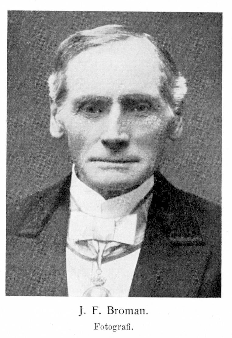Broman, Johan Fredrik, f. 24 juni 1839 i Västra Eds församling, d. 6 juni 1917 i Östersund. Föräldrar: mjölnaren Karl Fredrik Broman och Lisa Persdotter. Elev vid Västerviks h. allmänna läroverk 1849–56; elev och bokhållare vid Lindö i Östergötland 1857–61; elev vid Ultuna lantbruksinstitut 24 okt. 1861–24 sept. 1863. Vik. lärare och inspektor vid Ultuna lantbruksinstitut 1 febr. 1863–31 aug. 1864; förste lärare vid lantbruksskolorna i Varplösa på Gotland 1864–65 och i Fänneslunda i Älvsborgs län 1865–67; föreståndare för sistnämnda skola 1867–77 och för Ope lantbruksskola (från 1884 lantmannaskola) i Jämtlands län 1 nov. 1877–1 nov. 1905; föreståndare för Jämtlands läns frökontrollanstalt från 1881 till sin död; sekreterare i länets fröodlingsförening från 1882 till föreningens upphörande i början av 1890-talet; Jämtlands läns landstings revisor 1883–84[1]; ledamot av förvaltningsutskottet i Jämtlands läns hushållningssällskap 1883–86 och 1914–17; sekreterare och skattmästare i samma hushållningssällskap 1886–1914.; ordförande i nämnden för premiering av nötboskap 1888–1910; ledamot av Allmänna svenska utsädesföreningens (från 1894 Sveriges utsädesförenings) större styrelse 1888–1913; suppleant i styrelsen för Svenska mosskulturföreningen 26 nov. 1896; ordförande i prisnämnden för fjällras vid de allmänna lantbruksmötena i Malmö 1896, i Gävle 1901 och i Norrköping 1906, i nämnden för premiering av mindre jordbruk i Jämtlands län 1902–05, i urvalsnämnderna för bildande av avelscentra för fjällboskap 1903, i avelscentranämnderna för samma ras 1905, 1908 och 1913, i skogsvårdsstyrelsen inom Jämtlands läns landstingsområde 12 aug. 1903 (räknat från 1 jan. 1905)–1914, i styrelsen för Jämtlands folkbank 1906–17 samt i jordbrukskommissionen i Jämtlands län 1 sept. 1909–31 maj 1917. RVO 1891; LLA 1895; erhöll Jämtlands läns hushållningssällskaps guldmedalj 1898 och konungens hederspris vid lantbruksmötet i Gävle 1901; RNO 1902; HedLLA 1910; erhöll guldmedalj för medborgerlig förtjänst 1911 och Lantbruksakademiens stora guldmedalj 1913.