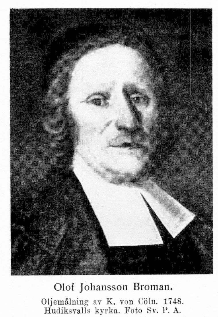 Broman, Olof Johansson, f. 29 nov. 1676 i Välsta, Rogsta socken, d. 9 apr. 1750 i Hudiksvall. Föräldrar: kronofogden Johan Larsson Broman och Anna Albogia. Studerade i Hudiksvalls skola från 1682 och under informator i Uppsala från hösten 1689; student i Uppsala 17 febr. 1690; disp, 5 febr. 1698 (Qvatuor virtutes ...., quas cardinales vulgo nominant; pres. A. Goeding); avlade examen i teol. fakulteten 14 maj s. å.; erhöll stipendium 1699; undergick examen rigorosum 30 maj 1703; disp. 23 juni s. å. (Mare Balticum; pres. H. Vallerius); fil. magister 10 dec. s. å. »ibland the främste». Vik. rektor vid Hudiksvalls trivialskola okt. 1703–maj 1705; vik. lektor i logik och fysik vid Gävle gymnasium okt. 1705–juni 1706; tjänstgjorde tidvis som adjunkt och v. pastor i Rogsta och Ilsbo under åren 1706–14; prästvigd i Uppsala 21 dec. 1710; konrektor vid Hudiksvalls trivialskola sept. 1713; v. pastor i Hudiksvall och Idenor 1715–18 och 1723; rektor vid Hudiksvalls trivialskola 19 aug. 1719; avlade pastoralexamen i Uppsala 20 aug. 1728; kyrkoherde i Hudiksvall och Idenor 31 okt. s. å.; prost över egna församlingar 11 aug. 1736. LVS 1729.