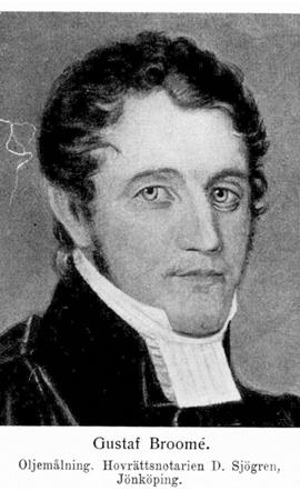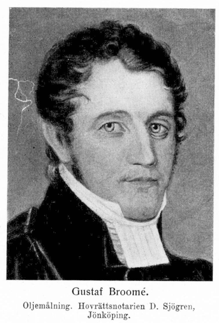 1. Gustaf Broomé, f. 20 apr. 1786 i Tranås, Lunds stift, d. 20 jan. 1865 i Lund. Föräldrar: kyrkoherden i Tranås och Onslunda, prosten Simon Johannes Broomé och Maria Bergström. Erhöll enskild undervisning; student i Lund 24 febr. 1801; disp. 20 juni 1804 (Dissertatio de diis Iliadis, P. 2; pres. Es. Tegnér); filol. kand. 17 dec. 1806.; fil. kand. 9 apr. 1808; disp. maj s. å. (Tympanum Schamanico-Lapponicum in Museo historico Lundensi, P. 2; pres. N. H. Sjöborg); fil. magister 23 juni s. å. Preceptor för majoren greve K. F. Dückers söner Karl Fredrik och Kristian Vilhelm Rutger från 1808; e. o. amanuens vid universitetsbiblioteket i Lund 22 sept. 1810; prästvigd 15 dec. 1811; teol. docent 23 nov. 1812; notarie i skånska nationen s. å.–1814; ordinarie amanuens vid universitetsbiblioteket 14 okt. 1816; avlade pastoralexamen 7 dec. s. å.; prefekt vid teol. seminariet 28 mars 1817; kyrkoherde i Västra Kärrstorps och Glostorps prebendepastorat 6 maj 1818 (tillträdde 1820); kyrkoherde i Västra Sallerup och Remmarlöv på patronus kallelse 1819 (tillträdde 1 maj 1821); erhöll avsked från amanuensbefattningen vid universitetsbiblioteket i Lund 1820; prost över egna församlingar 26 sept. 1821; riksdagsman 1828–30; ledamot av Malmöhus läns hemmansklyvningskommitté 1833 (jmfr K. brev 26 okt. s. å.) –1834 (betänkandet ink. 23 maj) samt 1841 (jmfr K. brev 14 aug. s. å.) –14 jan. 1842; ordförande i direktionen för skånska prästerskapets byggnadskassa 1839–48; lämnade pastoratets skötsel åt vice pastor 1848. Ledamot av Samfundet pro fide et christianismo och av Sällskapet för nyttiga kunskapers spridande; fil. jubelmagister 1 juni 1859.