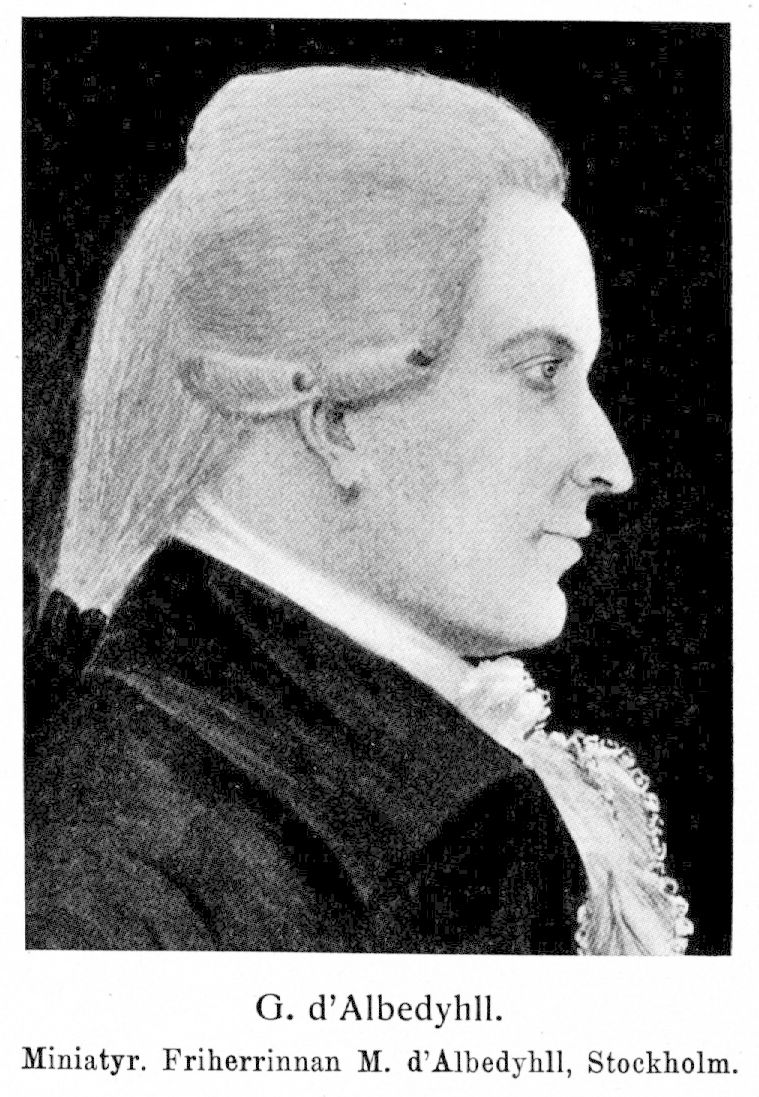 2. Gustaf d'Albedyhll, den föregåendes sonson, f. 31 mars 1758 i Stralsund, d. 11 aug. 1819 på Lövsund, Runtuna socken. Föräldrar: överstelöjtnanten Krister Reinhold d'Albedyhll och friherrinnan Helena Dorotea Elisabet von Eickstedt. Vistades, hos morbrodern, preussiske överhovmarskalken friherre A, L. M. von Eickstedt-Peterswaldt från 1762; kom till Sverige 1774; student i Lund 19 dec. 1774; avlade kansliexamen. Kammarjunkare 6 juni 1776; andre sekreterare i presidentkontoret 20 juni 1776; kommissionssekreterare i S: t Petersburg 31 juli 1778; tf. chargé d'affaires därstädes aug.–sept. 1780 och 10 maj 1782–nov. 1783; bevistade mötet mellan Gustav III och Katarina II i Fredrikshamn. 1783; en av konungens tjugufyra kammarjunkare 1783; hemkallades 20 aug, 1784; minister en second i Köpenhamn 15 sept. 1784 (tillträdde jan. 1785)–nov. 1785; kammarherre hos drottningen 1787; ånyo minister i Köpenhamn nov. 1787; rappellerad 10 apr. 1789; minister i Hamburg och Bremen 2 juni 1789 men avböjde denna befattning; avfärdad till Pommern för att undersöka förvaltningen därstädes 24 maj 1793 (avgav relation 22 juli); konstituerad att bereda pommerska och wismarska ärenden 15 okt. 1793; bevistade riksdagen 1809–10, och var därunder bl.a. ordförande i expeditionsutskottet och ledamot av hemliga utskottet.