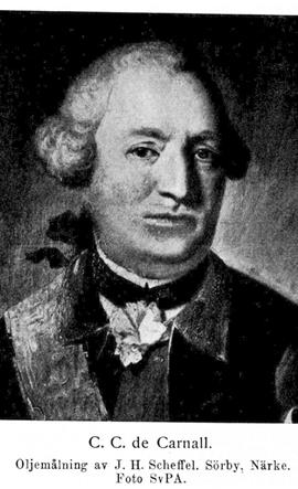 Källor: Biographica, krigsexpeditionens diarier, militaria: meritlistor och meritförteckningar, överstens för Björneborgs regemente skrivelser till K. M: t, skrivelser till Gustav III och till Johan Sparre (Tosterupsamlingen), handels-och manufakturdeputationens prot. 1769—70, militiedeputationens prot. 1771 —72, strödda hist. handlingar ang. svenska officerare i kon. Stanislaus' tjänst, allt i RA; genealogica och biographica, riddarhusarkivet; danska ministerdepescher och Sverrig C. 289, danska riksarkivet. — Aktstykker vedkommande det svenske thronfölgervalg 1743 (Aarsberetninger fra det kongeligc Geheimearchiv, 5, 1871—75); Hemliga handl. hörande till Sveriges historia efter kon. Gustaf III: s äntrade till regeringen, 2—3 (1822, 25); Lefwernes beskrifning öfwer framl. general majoren. . . herr baron Carl Constantin de Carnall (Tidningar utg. af et sällsk. i Åbo, Årg. 6, 1776; utdrag ur de C:s memoarer med enstaka ordagranna citat); F. A. von Fersen, Hist. skrifter, 3 (1869); E. G. Geijer, Kon. Gustaf'III: s efterlemnade . . . papper, 1—2 (1843); B. von Schinkel & C. W. Bergman, Minnen ur Sveriges nyare historia, 1 (1852). — CG. A. Bergenstråhle, Kungl. Västerbottens regementes krigshistoria (1917); E. Lindh, Kongl. Björneborgs regemente (Skrifter utg. av Sv. litt.-sällskapet i Finland, 204, 1928); C. G. Malmström, Sveriges polit. historia 1718—1772, 4, 6 (1899, 1901); O. Mannerfelt, Anteckningar om Kongl. Elfsborgs regemente 1680—1815 (1887); C. T. Odhner, Sveriges polit. historia under kon. Gustaf III: s regering, 1 (1885); A. Pihlström, Kungl. Dalregementets historia, 4 (1910); Sv. biogr. lexikon, Ny följd, 3 (1859—60); T. Säve, Sveriges deltagande i sjuåriga kriget (1915).
