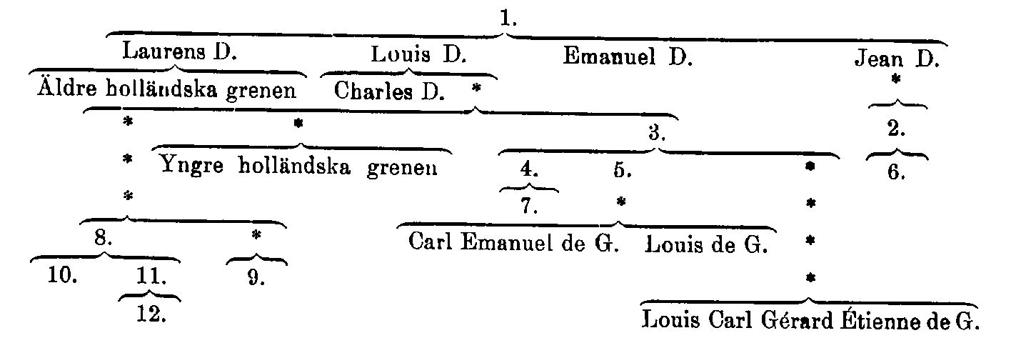 A) Finspångsgrenen. En sonson till den ovannämnde Louis D. d. y., kammarherren och tituläröverintendenten Louis D. (f. 1705, f 1758), är författare till en 1816 genom Lorenzo Hammarsköld utgiven historia över släkten. Hans son överkammarherren Jean Jacques D. (f. 1737, d. 1809) blev friherre 1 nov. 1797; ättlingar av honom äro statsministern Louis Gerard D. (se nedan 8), dennes söner Gerard Louis D., f. d. landshövding och statsminister (se nedan 10), och geologen professor Gerard Jakob D. (se nedan 11) samt den sistnämndes son, professor Sten D. (se nedan 12). Ättegrenens nu levande huvudman är f. d. majoren friherre Carl Gustaf Gerard D. (f. 1859), styrelseordförande och ekonomidirektör i Almqvist å Wiksells boktryckeriaktiebolag. Till samma ättegren höra f. d. landshövdingen friherre Fabian Otto Gerard D., preses i lantbruksakademien (se nedan 9), och dennes son Johan Gustaf Gerard D. (f. 1889), disponent för Lesjöfors aktiebolag och författare till arbeten angående bergs- och näringsväsen. Ättegrenens yngsta linje representeras av förste kammarherren friherre Jean-Jacques Gerard D. (f. 1863).