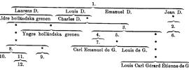 C) Leufstagrenen. Louis D. d. ä:s son Emanuel D. (f. 1624, d. ogift 1692) testamenterade det honom tilldelade Lövsta bruk till brodern Louis d. y:s son Charles D. (f. 1660, d. likaledes ogift 1730), vilken fick landshövdings titel och kort före sin död gjorde Lövsta till fideikommiss för sin brorson Charles D. (se nedan 3), den kände vetenskapsmannen. Denne upphöjdes till friherre 29 aug. 1773. Söner till honom voro politikern kammarherren Charles D. (se nedan 4) och riksrådet Emanuel de G. (se nedan 5), för vilken senare hans moder Katarina Charlotta Rib-bing 1779 stiftade Frötuna fideikommiss. Den förre var fader till excellensen och lantmarskalken Carl D. (se nedan 7), vilken fick grevlig värdighet 11 maj 1818 men själv slöt sin greveätt. Lövsta fideikommiss övergick vid hans död 1861 till riksrådet Emanuel de G: s sonson, kabinettskammarherren friherre Carl Emanuel de G. (f. 1817, f 1877), och efterhonom först till hans broder, hovmarskalken friherre Louis de G. (f. 1824, f 1887), och därefter successive till dennes söner, friherre Carl Louis Emanuel de G. (f. 1859, d. 1914) och kammarherren friherre Louis de G. (f. 1866, f 1925). Den senare överlämnade genom gåvobrev av28jän, 1915 till Uppsala universitetsbibliotek, i enlighet med den äldre broderns önskan, ett av denne under fyrtioårig samlarverksamhet hopbragt dyrbart naturvetenskapligt och geografiskt bibliotek, som enligt donators förordnande skall förvaras som särskild samling. Samma år utgavs »Ex bibliotheca Leufstadiensi Caroli de Geer», en förnämligt utstyrd volym, som utom kataloger över biblioteket innehåller en förteckning över arbeten reproducerade eller eljes utgivna på föranstaltande av Carl de G.