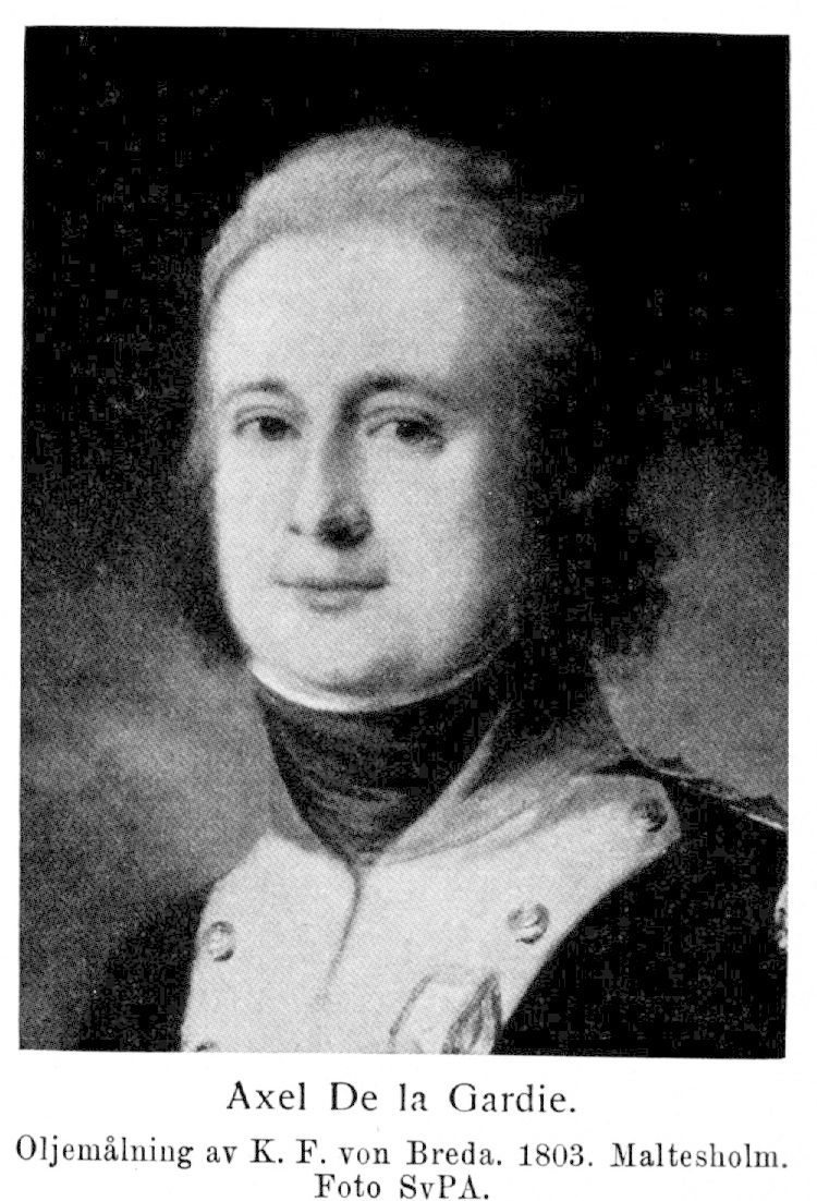 16. Axel Gabriel De la Gardie, den föregåendes broder, f. 23 nov. 1772 i Stockholm, d 15 jan. 1838 på Maltesholm i Östra Sönnarslöv. Korpral vid Västgöta kavalleriregemente 2 juli 1777; sergeant vid Västmanlands regemente 24 jan. 1781; sekundadjutant därstädes 7 febr. 1781; fänrik 12 apr. 1786; stabslöjtnant vid premiärmajorens kompani 25 mars 1790; stabsadjutant hos konungen och kapten i armén 23 aug. 1790 med fullmaktsdatum 19 aug. 1790; ambassadkavaljer till S:t Petersburg 1790; hovkavaljer hos prins Fredrik Adolf 2 maj 1791; löjtnant vid Salbergs kompani 17 juni 1793; stabskapten vid Västmanlands regemente 26 aug. 1793; kammarherre hos änkedrottning Sofia Magdalena 1793; överadjutant hos konungen och major i armén 2 nov. 1795; deltog i riksdagarna 1800, 1815, 1828—30 och 1834—35 samt var därunder bl. a. ordförande i riddarhusutskottel. 1800 och ledamot av bevillningsutskottet 1815; major i Kronobergs regemente 1 sept.. 1800; erhöll avsked från befattningen som överadjutant hos konungen 2 apr. 1807; förste adjutant hos fältmarskalken J. Kr. Toll; överadjutant och överstelöjtnant i armén 29 juni 1809; överste i armén och generalstaben 1809; erhöll avsked 27 mars 1810; landshövding i Kristianstads län 4 febr. 1811; erhöll avsked från landshövdingeämbetet 12 jan. 1838. RSO 1799; KmstkNO 1818; hedersledamot av Jämtlands läns hushållningssällskap 1819; RCXIII:sO 1825.