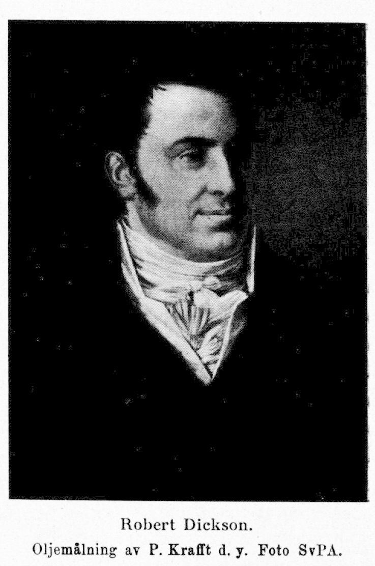 1. Robert Dickson d. ä., f. 18 juni 1782 i Montrose, Skottland, d. 11 dec. 1858. Föräldrar: handlanden James Dickson och Christian Moorie (Christina Murray eller Christian Murie). På kontor i Montrose och från 1802 i Göteborg, burskap där 6 aug. 1808; engros- och rederirörelse från 1807; delägare i firman James D. & Co. 1816; led. och ordf. (från 1842) i styr. för Göteborgs handelsinstitut 1832—55; v. ordf. i styr. för Handelsföreningen 1850—55.