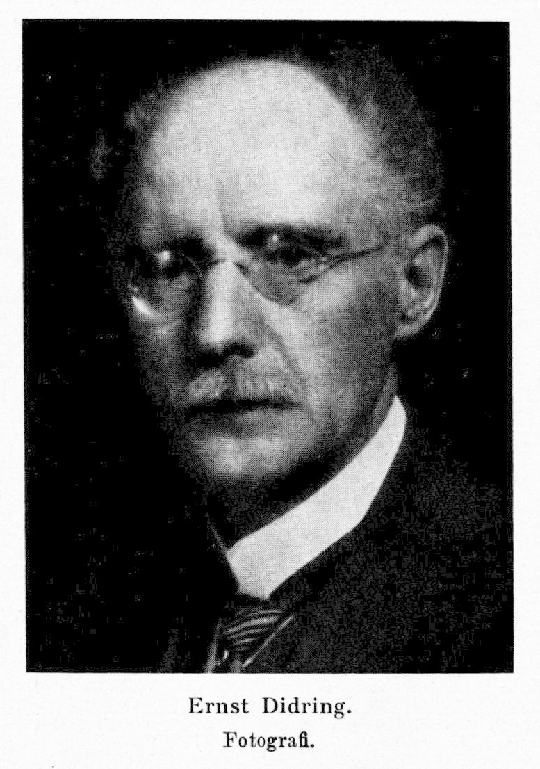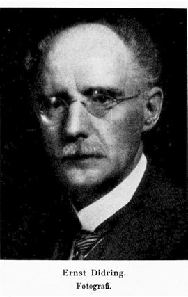 Didring, Ernst, f. 18 okt. 1868 i Stockholm (Hed v. EL), d. 13 okt. 1931 där. Föräldrar: litografen Anders Gustaf Andersson och Juliana Maria Hellberg, vilkas söner togo namnet Didring. Gick i folkskola, Ladugårdslands allm. läroverk och h. latinläroverket å Norrmalm i Stockholm; e. o. kontors skrivare vid Statens järnvägar 1884; kontorsskrivare 1 jan. 1890; bokhållare 1 okt. 1903; 1:e bokhållare 1 mars 1908; avsked på egen begäran 1 april 19,14; fullmäktig i Statens järnvägstrafiks pensionsinrättning 1904—10; led. av direktionen för samma kassa 1910; led. av direktionen för Statens järnvägars änke- och pupillkassa 1911—1 april 1914; led. av och sekr. i pensionsfullmäktiges arbetsutskott 1906, ordf. 1908; bitr. sekr. i järnvägstaxekommittén 1909; ordf. i Sveriges författareförening 1915—20 och 1923—29; ordf. i och ledare av kulturella ungdomsrörelsen i Stockholm 1908—09; led. av Svenska röda korsets hjälpkommitté för krigsfångar 1915—20, v. ordf. 1920; teateranmälare i Dagen 1913—14, i Aftonbladet 1914—18. RVO 1920.